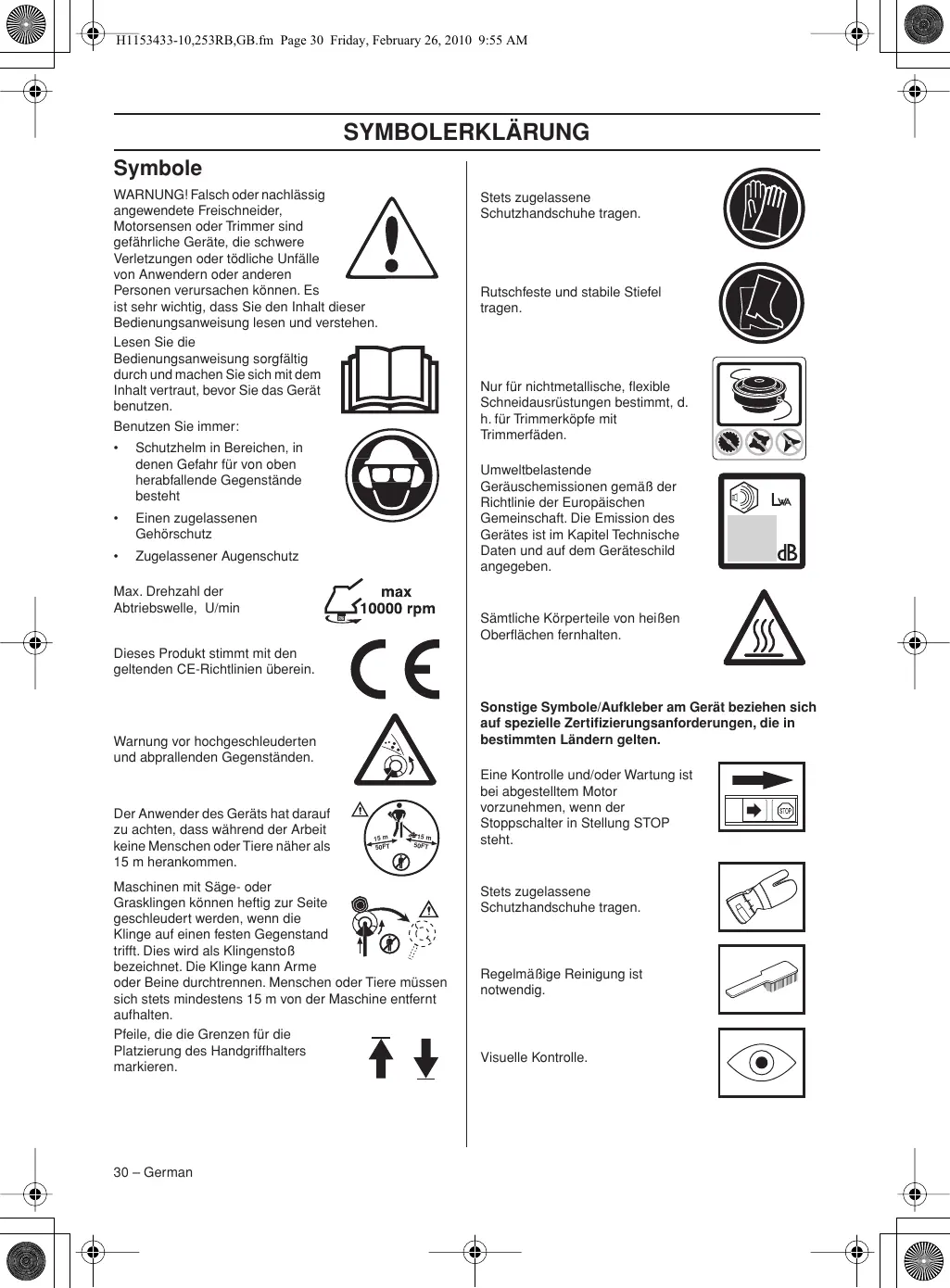 WARNUNG! Bei Benutzung von Gehörschützern immer auf Warnsignale oder Zurufe achten. Den Gehörschutz immer abnehmen, sobald der Motor abgestellt ist. HELM Schutzhelm in Bereichen, in denen Gefahr für von oben herabfallende Gegenstände besteht GEHÖRSCHUTZ Ein Gehörschutz mit ausreichender Dämmwirkung ist zu tragen. AUGENSCHUTZ Es ist immer ein zugelassener Augenschutz zu tragen. Bei der Benutzung eines Visiers ist auch eine zugelassene Schutzbrille zu tragen. Zugelassene Schutzbrillen sind in diesem Falle diejenigen, die die Normen ANSI Z87.1 für die USA bzw. EN 166 für EULänder erfüllen. H1153433-10,253RB,GB.fm Page 35 Friday, February 26, 2010 9:55 AM ALLGEMEINE SICHERHEITSVORSCHRIFTEN HANDSCHUHE Handschuhe sind dann zu tragen, wenn dies notwendig ist, z. B. bei der Montage der Schneidausrüstung. STIEFEL Stiefel mit Stahlkappe und rutschfester Sohle tragen. Weitere Informationen erteilt Ihnen gerne die nächste Servicewerkstatt. WICHTIG! Service und Reparatur des Gerätes erfordern eine Spezialausbildung. Dies gilt besonders für die Sicherheitsausrüstung des Gerätes. Wenn Ihr Gerät den unten aufgeführten Kontrollanforderungen nicht entspricht, müssen Sie Ihre Servicewerkstatt aufsuchen. Beim Kauf eines unserer Produkte wird gewährleistet, dass Reparatur- oder Servicearbeiten fachmännisch ausgeführt werden. Sollte der Verkäufer Ihres Gerätes nicht an unser Fachhändler-Service-Netz angeschlossen sein, fragen Sie nach unserer nächstgelegenen Servicewerkstatt.