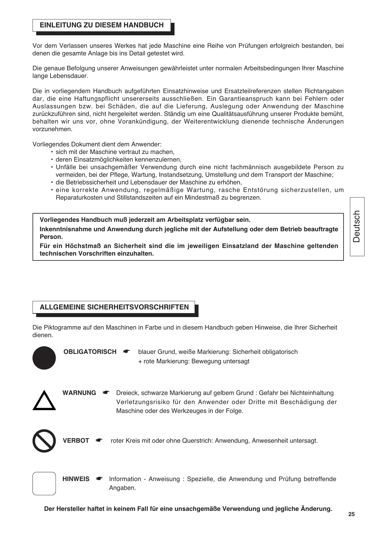 - eine korrekte Anwendung, regelmäßige Wartung, rasche Entstörung sicherzustellen, um Reparaturkosten und Stillstandszeiten auf ein Mindestmaß zu begrenzen. ALLGEMEINE SICHERHEITSVORSCHRIFTEN Die Piktogramme auf den Maschinen in Farbe und in diesem Handbuch geben Hinweise, die Ihrer Sicherheit dienen. OBLIGATORISCHxx☛ xxblauer Grund, weiße Markierung: Sicherheit obligatorisch OBLIGATORISCHxx☛ xx+ rote Markierung: Bewegung untersagt WARNUNGxx☛ WARNUNGxx☛ Dreieck, schwarze Markierung auf gelbem Grund : Gefahr bei Nichteinhaltung Verletzungsrisiko für den Anwender oder Dritte mit Beschädigung der Maschine oder des Werkzeuges in der Folge. VERBOTxx☛xx roter Kreis mit oder ohne Querstrich: Anwendung, Anwesenheit untersagt. HINWEISxx☛ Information - Anweisung : Spezielle, die Anwendung und Prüfung betreffende Angaben. Der Hersteller haftet in keinem Fall für eine unsachgemäße Verwendung und jegliche Änderung.