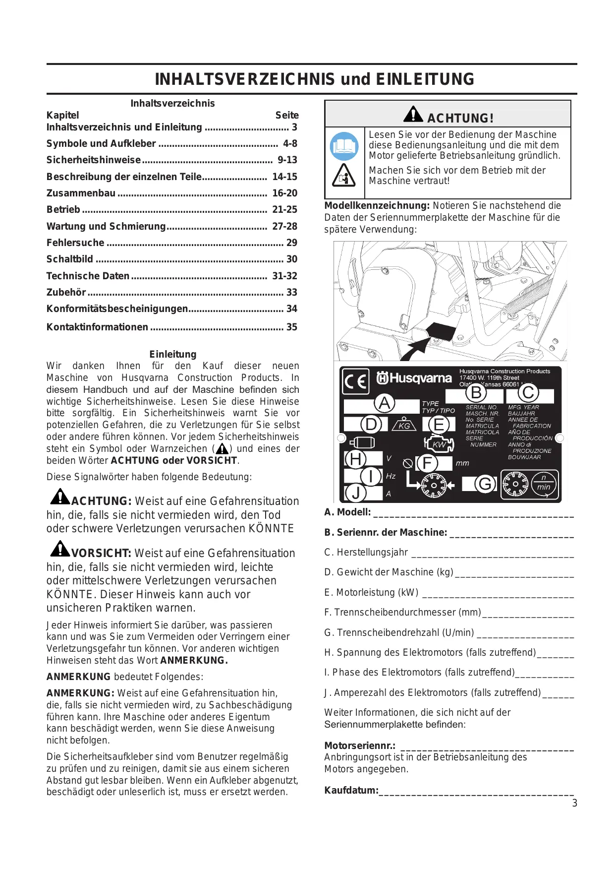 - Kontaktinformationen Einleitung Wir danken Ihnen für den Kauf dieser neuen Maschine von Husqvarna Construction Products. In diesem Handbuch und auf der Maschine befinden sich wichtige Sicherheitshinweise. Lesen Sie diese Hinweise bitte sorgfältig. Ein Sicherheitshinweis warnt Sie vor potenziellen Gefahren, die zu Verletzungen für Sie selbst oder andere führen können. Vor jedem Sicherheitshinweis steht ein Symbol oder Warnzeichen ( ) und eines der beiden Wörter ACHTUNG oder VORSICHT. Diese Signalwörter haben folgende Bedeutung: ACHTUNG: Weist auf eine Gefahrensituation hin, die, falls sie nicht vermieden wird, den Tod oder schwere Verletzungen verursachen KÖNNTE VORSICHT: Weist auf eine Gefahrensituation hin, die, falls sie nicht vermieden wird, leichte oder mittelschwere Verletzungen verursachen KÖNNTE. Dieser Hinweis kann auch vor unsicheren Praktiken warnen. Jeder Hinweis informiert Sie darüber, was passieren kann und was Sie zum Vermeiden oder Verringern einer Verletzungsgefahr tun können. Vor anderen wichtigen Hinweisen steht das Wort ANMERKUNG. A. Modell:______________________________________ B. Seriennr. der Maschine:________________________ C. Herstellungsjahr_ ______________________________ D. Gewicht der Maschine (kg)_______________________ E. Motorleistung (kW)_ ____________________________ F. Trennscheibendurchmesser (mm)__________________ G. Trennscheibendrehzahl (U/min)___________________ H. Spannung des Elektromotors (falls zutreffend)________ ANMERKUNG bedeutet Folgendes: p. 35