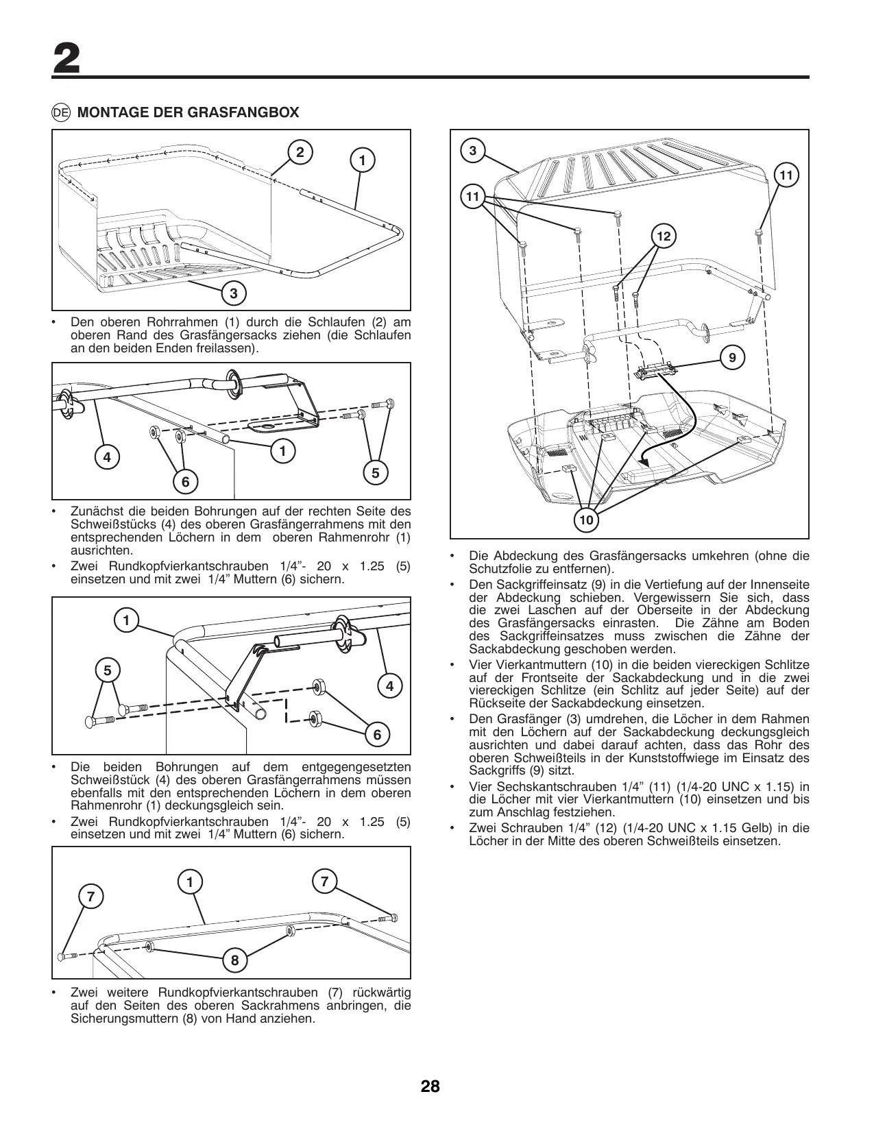 Die Abdeckung des Grasfängersacks umkehren (ohne die Schutzfolie zu entfernen). Den Sackgriffeinsatz (9) in die Vertiefung auf der Innenseite der Abdeckung schieben. Vergewissern Sie sich, dass die zwei Laschen auf der Oberseite in der Abdeckung des Grasfängersacks einrasten. Die Zähne am Boden des Sackgriffeinsatzes muss zwischen die Zähne der Sackabdeckung geschoben werden. Vier Vierkantmuttern (10) in die beiden viereckigen Schlitze auf der Frontseite der Sackabdeckung und in die zwei viereckigen Schlitze (ein Schlitz auf jeder Seite) auf der Rückseite der Sackabdeckung einsetzen. Den Grasfänger (3) umdrehen, die Lôcher in dem Rahmen mit den Lôchern auf der Sackabdeckung deckungsgleich ausrichten und dabei darauf achten, dass das Rohr des oberen SchweiBteils in der Kunststoffwiege im Einsatz des Sackgriffs (9) sitzt. Vier Sechskantschrauben 1/4” (11) (1/4-20 UNC x 1.15) in die Lôcher mit vier Vierkantmuttern (10) einsetzen und bis zum Anschlag festziehen. Zwei Schrauben 1/4” (12) (1/4-20 UNC x 1.15 Gelb) in die Lôcher in der Mitte des oberen SchweiBteils einsetzen.