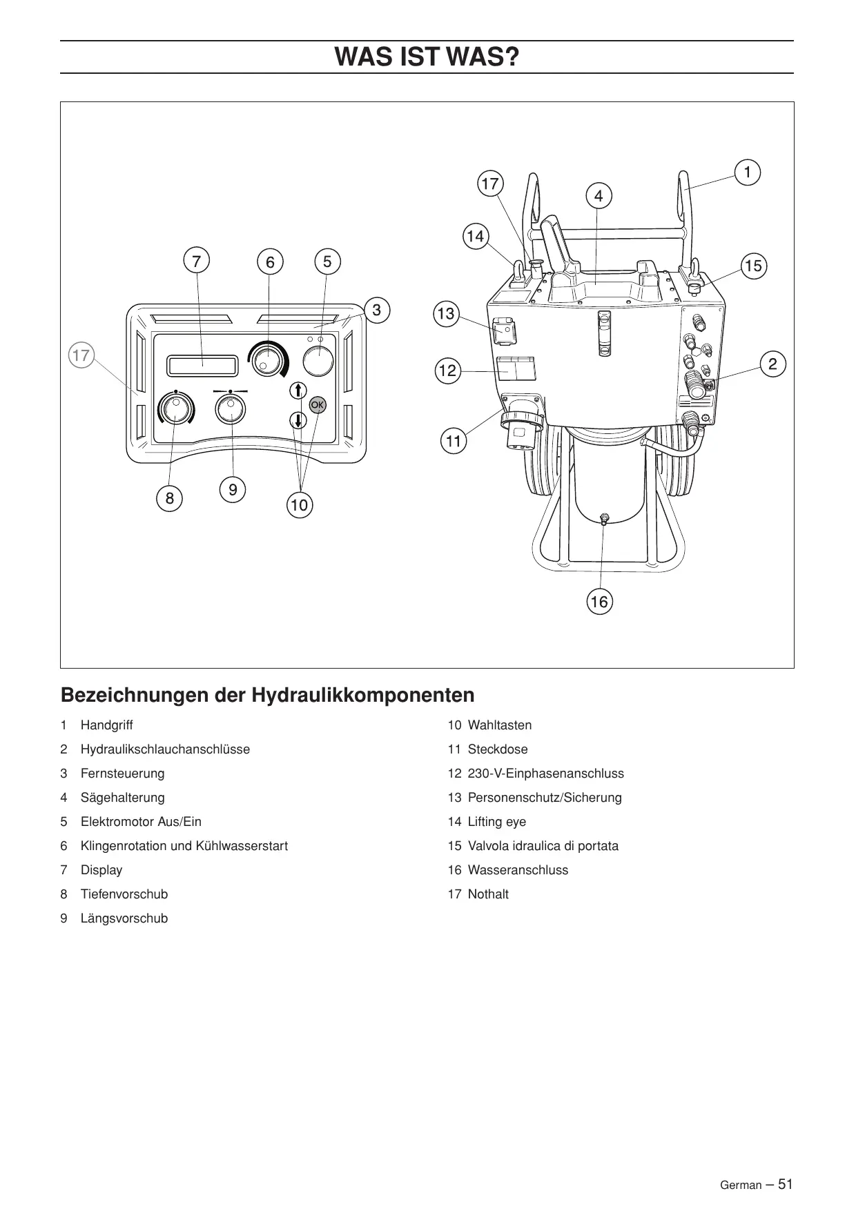 3 Fernsteuerung 12 230-V-Einphasenanschluss 4 Sägehalterung 13 Personenschutz/Sicherung 5 Elektromotor Aus/Ein 14 Lifting eye