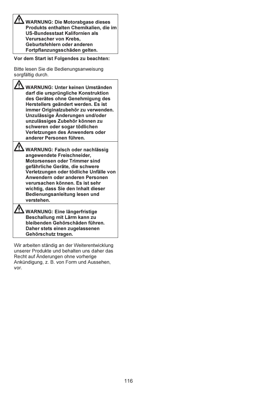 Contrôler les points suivants avant la mise en marche : Lisez attentivement le manuel d’utilisation. AVERTISSEMENT : Ne jamais modifier sous aucun prétexte la machine sans l’autorisation du fabricant. N’utiliser que des accessoires et des pièces d’origine. Des modifications nonautorisées et l’emploi d’accessoires non-homologués peuvent provoquer des accidents graves et même mortels, à l’utilisateur ou d’autres personnes. AVERTISSEMENT : Utilisés de manière négligente ou erronée, les scies d'éclaircissement et les coupe-herbes peuvent devenir des outils dangereux pouvant occasionner des blessures très graves, voire mortelles à l’utilisateur ou à d’autres personnes présentes. Il est très important de lire attentivement et de bien assimiler le contenu de ce manuel de l'opérateur. AVERTISSEMENT : Une exposition prolongée au bruit risque de causer des lésions auditives permanentes. Toujours utiliser des protecteurs d'oreilles agréés. Nous travaillons continuellement au développement de ses produits et nous réservons le droit d’en modifier, entre autres, la conception et l’aspect sans préavis.