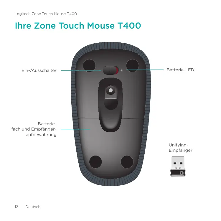 Logitech Zone Touch Mouse T400 Ihre Zone Touch Mouse T400 Ein-/Ausschalter Batterie-LED Batteriefach und Empfängeraufbewahrung UnifyingEmpfänger
