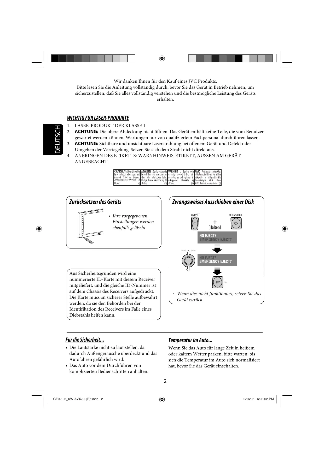 Wir danken Ihnen für den Kauf eines JVC Produkts. Bitte lesen Sie die Anleitung vollständig durch, bevor Sie das Gerät in Betrieb nehmen, um sicherzustellen, daf Sie alles vollständig verstehen und die bestmôgliche Leistung des Geräts erhalten.