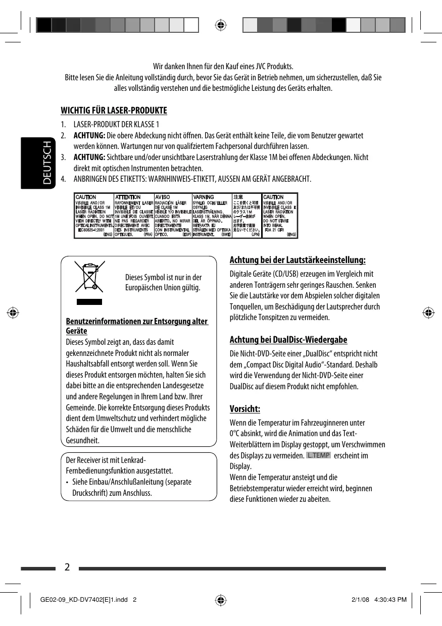 2/20/08 12:15:18 PM Wir danken Ihnen für den Kauf eines JVC Produkts. Bitte lesen Sie die Anleitung vollständig durch, bevor Sie das Gerät in Betrieb nehmen, um sicherzustellen, daß Sie alles vollständig verstehen und die bestmögliche Leistung des Geräts erhalten.