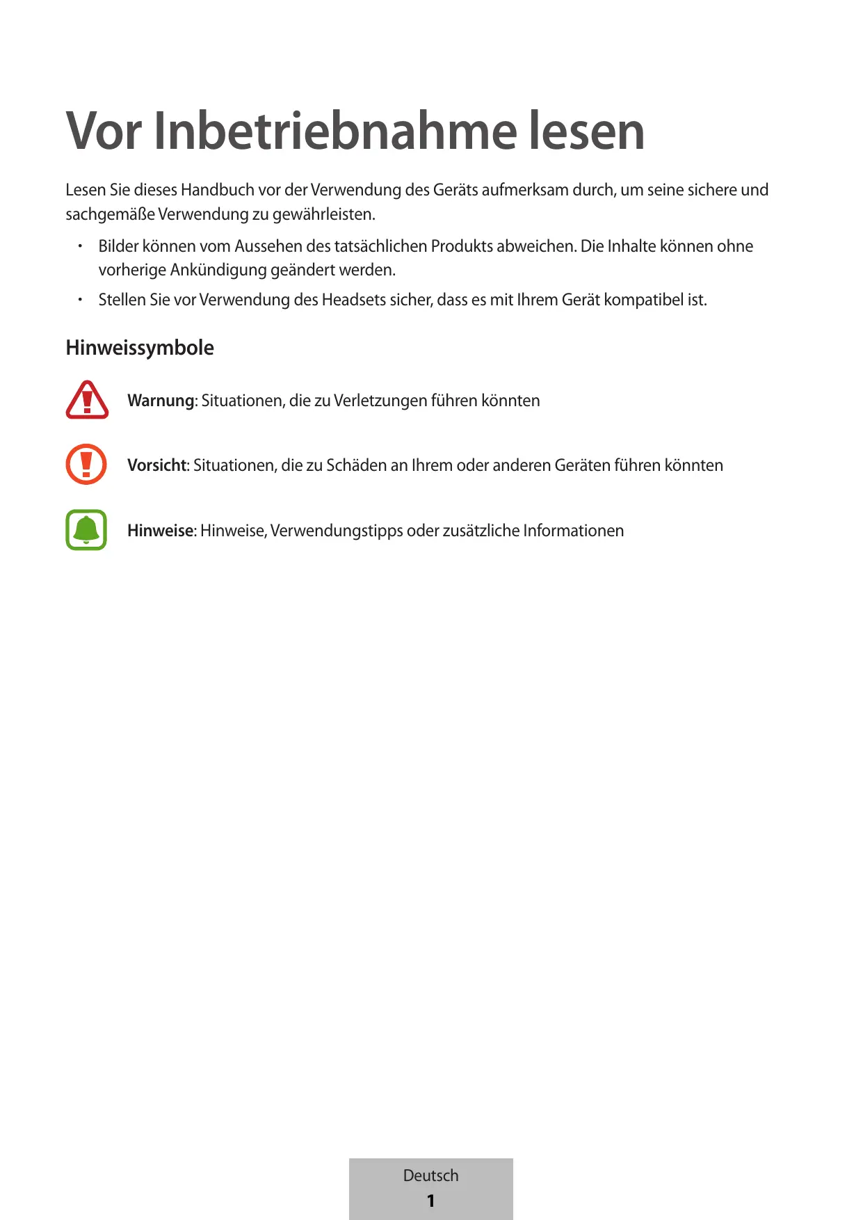 - Stellen Sie vor Verwendung des Headsets sicher, dass es mit Ihrem Gerät kompatibel ist. Hinweissymbole Warnung: Situationen, die zu Verletzungen führen könnten Vorsicht: Situationen, die zu Schäden an Ihrem oder anderen Geräten führen könnten Hinweise: Hinweise, Verwendungstipps oder zusätzliche Informationen Deutsch