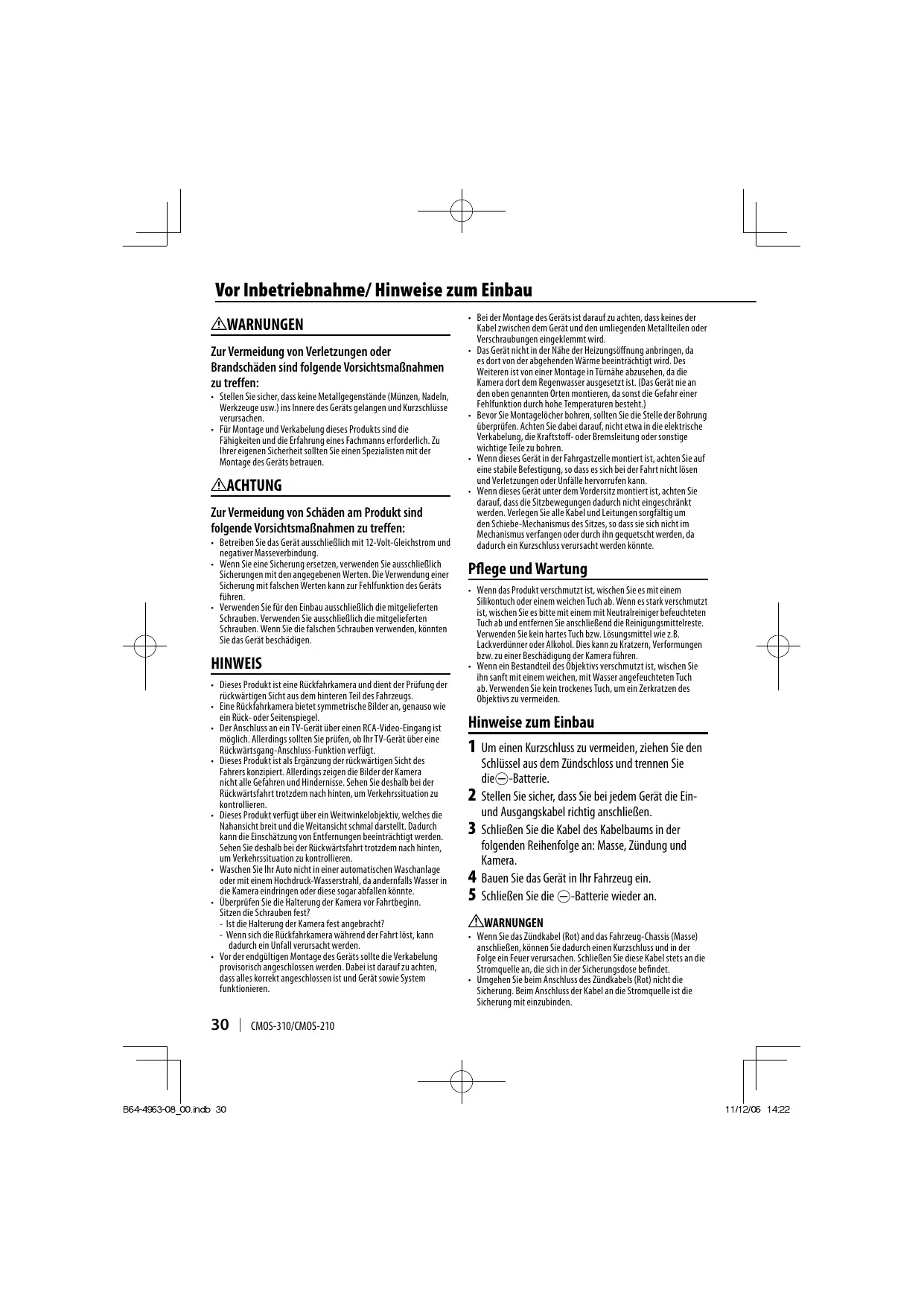 Allgemeine technische Daten Betriebsspannung: 14,4 V (9,0 V–16,0 V) Max. Stromverbrauch (CMOS-310): 80 mA Max. Stromverbrauch (CMOS-210): 60 mA • "Spiegelbild" bedeutet, dass auf dem Videobild genau wie im Rück- oder Seitenspiegel Links und Rechts umgekehrt wird. • Die technischen Daten können ohne vorherige Ankündigung geändert werden. Dieses Produkt wird weder vom Hersteller eines Fahrzeugs während der Produktion noch von einem professionellen Importeur eines Fahrzeugs in einen EU-Mitgliedsstaat eingebaut.