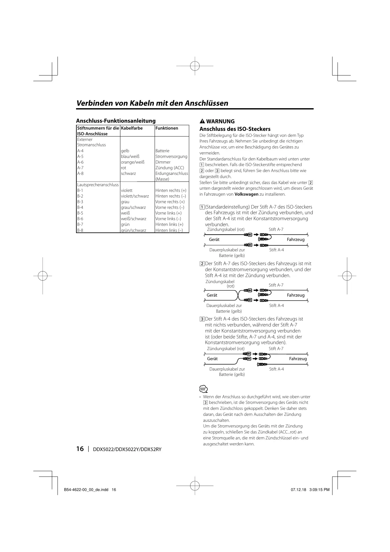 Verbinden von Kabeln mit den Anschlüssen Anschluss-Funktionsanleitung Stiftnummern für die ISO-Anschlüsse Externer Stromanschluss A-4 A-5 A-6 A-7 A-8 Lautsprecheranschluss B-1 B-2 B-3 B-4 B-5 B-6 B-7 B-8 Kabelfarbe Funktionen gelb blau/weiß orange/weiß rot schwarz Batterie Stromversorgung Dimmer Zündung (ACC) Erdungsanschluss (Masse) violett violett/schwarz grau grau/schwarz weiß weiß/schwarz grün grün/schwarz Hinten rechts (+) Hinten rechts (–) Vorne rechts (+) Vorne rechts (–) Vorne links (+) Vorne links (–) Hinten links (+) Hinten links (–) 2 WARNUNG Anschluss des ISO-Steckers Die Stiftbelegung für die ISO-Stecker hängt von dem Typ Ihres Fahrzeugs ab. Nehmen Sie unbedingt die richtigen Anschlüsse vor, um eine Beschädigung des Gerätes zu vermeiden. Der Standardanschluss für den Kabelbaum wird unten unter 1 beschrieben. Falls die ISO-Steckerstifte entsprechend 2 oder 3 belegt sind, führen Sie den Anschluss bitte wie dargestellt durch. Stellen Sie bitte unbedingt sicher, dass das Kabel wie unter 2 unten dargestellt wieder angeschlossen wird, um dieses Gerät in Fahrzeugen von Volkswagen zu installieren. 1 (Standardeinstellung) Der Stift A-7 des ISO-Steckers des Fahrzeugs ist mit der Zündung verbunden, und der Stift A-4 ist mit der Konstantstromversorgung verbunden. Zündungskabel (rot) Stift A-7 Gerät Dauerpluskabel zur Batterie (gelb) Fahrzeug Stift A-4 2 Der Stift A-7 des ISO-Steckers des Fahrzeugs ist mit der Konstantstromversorgung verbunden, und der Stift A-4 ist mit der Zündung verbunden. Zündungskabel (rot) Stift A-7 Gerät Dauerpluskabel zur Batterie (gelb) Fahrzeug Stift A-4 3 Der Stift A-4 des ISO-Steckers des Fahrzeugs ist mit nichts verbunden, während der Stift A-7 mit der Konstantstromversorgung verbunden ist (oder beide Stifte, A-7 und A-4, sind mit der Konstantstromversorgung verbunden). Zündungskabel (rot) Stift A-7 Gerät Dauerpluskabel zur Batterie (gelb) Fahrzeug Stift A-4