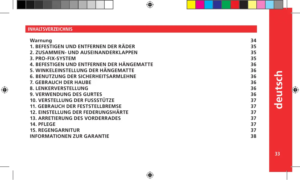 Zur Arretierung des Vorderrades drücken Sie auf den sich hinter dem Vorderradhalter befindenden Knopf. 20 14.- PFLEGE Polstereinlage nicht übermäßig lange einer direkten Sonneneinstrahlung aussetzen. Plastikteile mit lauwarmem Wasser und Seife reinigen. Anschließend alle Bauteile sorgfältig trocknen. Zum Waschen kann die Polstereinlage herausgenommen werden. Überprüfen Sie regelmäßig die Bremsen, die Hosenträgergurte und die Befestigungen, die aufgrund der Benutzung Schäden erleiden können. Fetten Sie die beweglichen Teile und Vorrichtungen regelmäßig mit einem Spray auf Silikonbasis ein. Verwenden Sie weder Öl noch Fett! Denken Sie daran Ihre Bremse regelmäßig nach der in Abbildung 18 erklärten Methode einzustellen. Sowohl zu Ihrer Sicherheit als auch zur guten Konservierung des Produktes ist es wichtig, eine regelmäßige Überprüfung in einer unserer offiziellen Werkstätten vornehmen zu lassen. deutsch