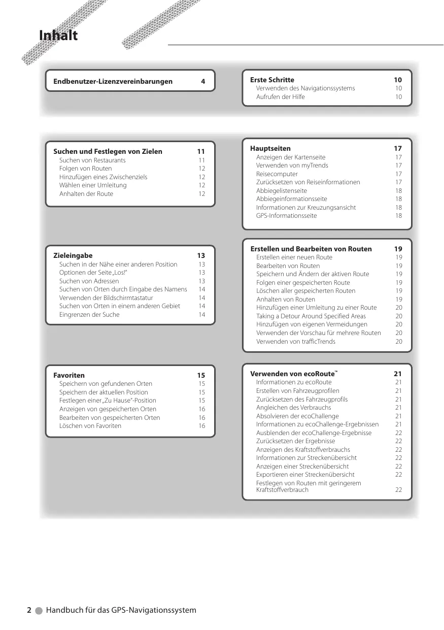 GPS-NAVIGATIONSSYSTEM © B64-4945-08C Inhalt Endbenutzer-Lizenzvereinbarungen Suchen und Festlegen von Zielen Suchen von Restaurants Folgen von Routen Hinzufügen eines Zwischenziels Wählen einer Umleitung Anhalten der Route Zieleingabe Suchen in der Nähe einer anderen Position Optionen der Seite „Los!“ Suchen von Adressen Suchen von Orten durch Eingabe des Namens Verwenden der Bildschirmtastatur Suchen von Orten in einem anderen Gebiet Eingrenzen der Suche Favoriten Speichern von gefundenen Orten Speichern der aktuellen Position Festlegen einer „Zu Hause“-Position Anzeigen von gespeicherten Orten Bearbeiten von gespeicherten Orten Löschen von Favoriten