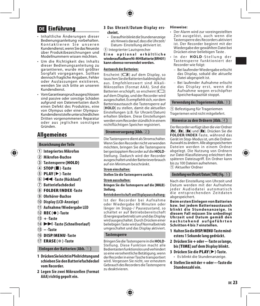 - Daraufhin blinkt die Stundenanzeige als Hinweis darauf, dass die Uhrzeit/ Datum- Einstellung aktiviert ist. 1 Integrierter Lautsprecher Eine optional erhältliche wiederaufladbare Ni-MH Batterie (BR401) kann ebenso verwendet werden. Austausch der Batterien: Erscheint [N] auf dem Display, so tauschen Sie die Batterien baldmöglichst aus. Empfehlenswer t sind Alkali Mikrozellen (Format AAA). Sind die Batterien erschöpft, so erscheint [O] auf dem Display, und der Recorder wird ausgeschaltet. Es empfiehlt sich, vor dem Batterieaustausch die Tastensperre auf [HOLD] zu stellen, damit die aktuellen Einstellungen (z.B. für Uhrzeit/Datum) erhalten bleiben. Diese Einstellungen werden vom Recorder stündlich in einem nichtflüchtigen Speicher registriert. Stromversorgung (Abb. 2) Die Tastensperre dient als Stromschalter. Wenn Sie den Recorder nicht verwenden möchten, bringen Sie die Tastensperre bei gestopptem Recorder auf die HOLDStellung. Dadurch wird der Recorder ausgeschaltet und der Batterieverbrauch auf ein Minimum beschränkt. Strom einschalten: Stellen Sie die Tastensperre zurück. Strom ausschalten: Bringen Sie die Tastensperre auf die [HOLD]Stellung. Betriebsbereitschaft und Displayausschaltung: Ist der Recorder bei Aufnahme oder Wiedergabe 60 Minuten oder länger im Stopp-/ Pausezustand, so schaltet er auf Betriebsbereitschaft (Energiesparbetrieb) um und das Display wird ausgeschaltet. Durch Drücken einer beliebigen Taste wird auf Normalbetrieb umgeschaltet und das Display aktiviert. Tastensperre Bringen Sie die Tastensperre in die HOLDStellung. Diese Funktion macht alle Bedientasten funktionslos und verhindert so eine versehentliche Betätigung, wenn der Recorder in einer Tasche transportiert wird. Vergessen Sie nicht, vor erneutem Gebrauch des Recorders die Tastensperre zu deaktivieren. Hinweise: