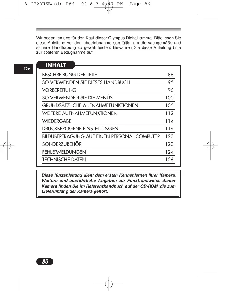 Page 86 Wir bedanken uns für den Kauf dieser Olympus Digitalkamera. Bitte lesen Sie diese Anleitung vor der Inbetriebnahme sorgfältig, um die sachgemäße und sichere Handhabung zu gewährleisten. Bewahren Sie diese Anleitung bitte zur späteren Bezugnahme auf.