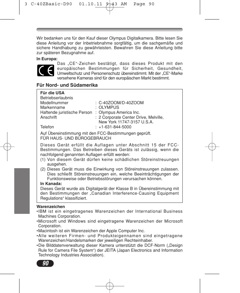 La marque “CE” indique que ce produit est conforme avec les exigences européennes en matière de sécurité, santé, environnement et protection du consommateur. Les appareils photo marqués “CE” sont prévus pour la vente en Europe. Pour les consommateurs des Amériques du Nord et du Sud Pour les utilisateurs aux États-Unis Déclaration de conformité Numéro de modèle : C-40 ZOOM/D-40 ZOOM Nom de marque : OLYMPUS Partie responsable : Olympus America Inc. (1) Cet appareil ne doit pas causer de brouillage radioélectrique. (2) Cet appareil doit pouvoir résister à toutes les interférences, y compris celles susceptibles d'entraver son bon fonctionnement. Pour les utilisateurs au Canada Cet appareil numérique de la catégorie B est conforme à la législation canadienne sur les appareils générateurs de parasites. Marques commerciales •IBM est une marque déposée de la firme International Business Machines Corporation. •Microsoft et Windows sont des marques déposées de la firme Microsoft. •Macintosh est une marque de Apple Computer Inc. •Tous les autres noms de sociétés et appellations de produits sont des marques déposées et/ou des marques de fabrique des propriétaires respectifs. •Le standard pour les systèmes de fichier d’appareil photo indiqué dans ce manuel est le standard “Design rule for Camera File system/DCF” stipulé par l’association JEITA (Japan Electronics and Information Technology Association).