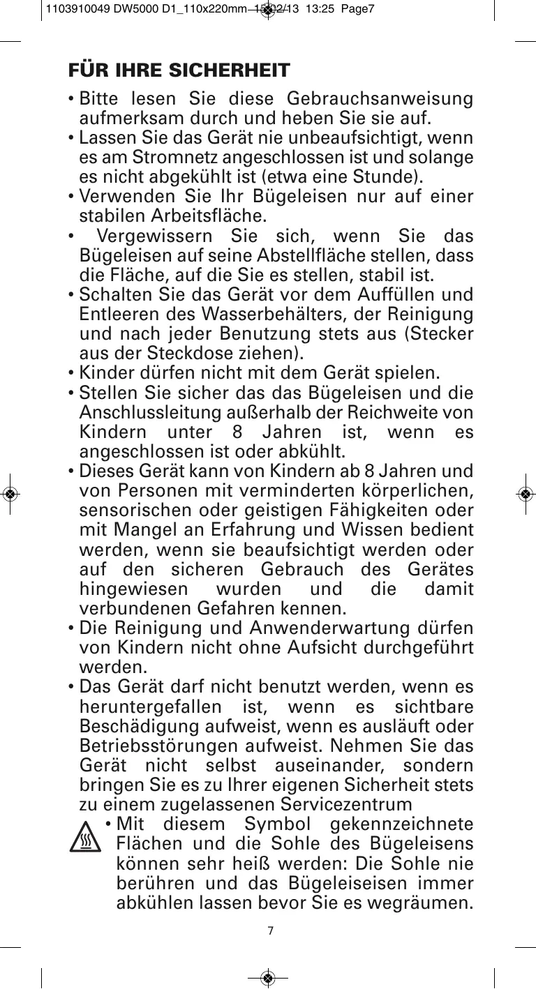 * Schalten Sie das Gerät vor dem Auffüllen und Entleeren des Wasserbehälters, der Reinigung und nach jeder Benutzung stets aus (Stecker aus der Steckdose ziehen). Kinder dürfen nicht mit dem Gerät spielen. Stellen Sie sicher das das Bügeleisen und die Anschlussleitung aufRerhalb der Reichweite von Kindern unter 8 Jahren ist, wenn es angeschlossen ist oder abkühlt. Dieses Gerät kann von Kindern ab 8 Jahren und von Personen mit verminderten kôrperlichen, sensorischen oder geistigen Fähigkeiten oder mit Mangel an Erfahrung und Wissen bedient werden, wenn sie beaufsichtigt werden oder auf den sicheren Gebrauch des Gerâätes hingewiesen wurden und die damit verbundenen Gefahren kennen.