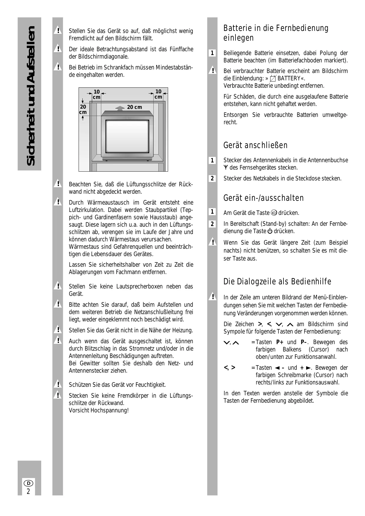 Lassen Sie sicherheitshalber von Zeit zu Zeit die Ablagerungen vom Fachmann entfernen. Stellen Sie keine Lautsprecherboxen neben das Gerät. Bitte achten Sie darauf, daß beim Aufstellen und dem weiteren Betrieb die Netzanschlußleitung frei liegt, weder eingeklemmt noch beschädigt wird. Stellen Sie das Gerät nicht in die Nähe der Heizung. Auch wenn das Gerät ausgeschaltet ist, können durch Blitzschlag in das Stromnetz und/oder in die Antennenleitung Beschädigungen auftreten. Bei Gewitter sollten Sie deshalb den Netz- und Antennenstecker ziehen. Schützen Sie das Gerät vor Feuchtigkeit. Stecken Sie keine Fremdkörper in die Lüftungsschlitze der Rückwand. Vorsicht Hochspannung!