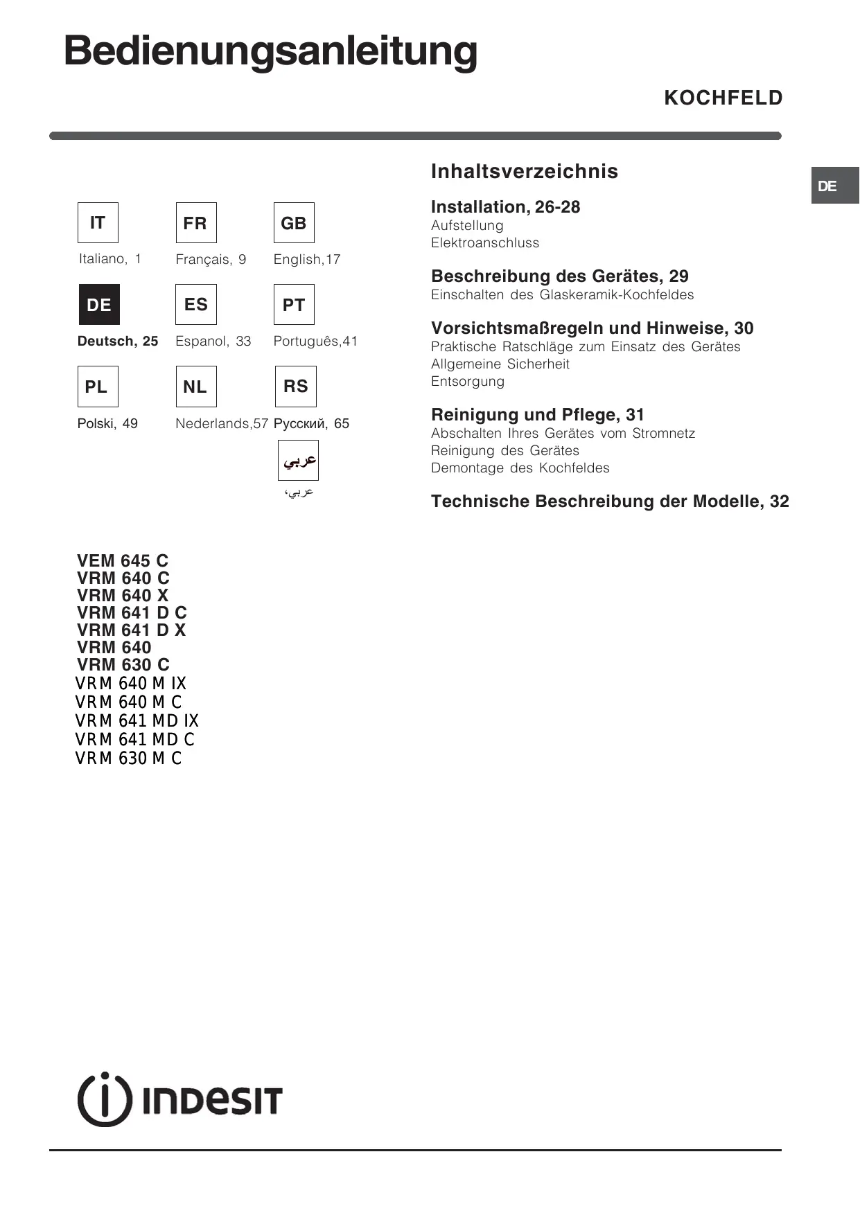 BEDIENUNGSANLEITUNG VRM640 INDESIT