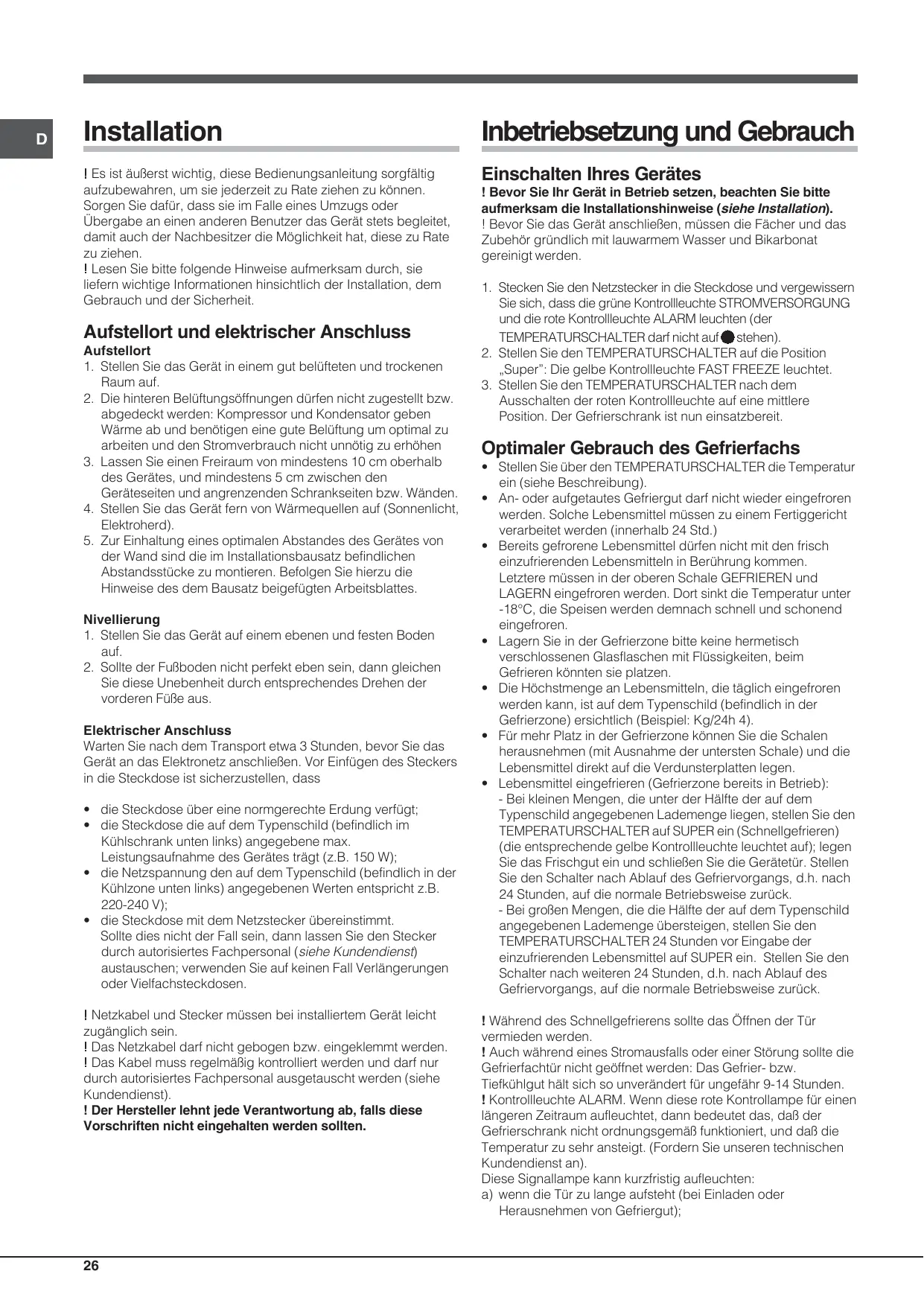 - grandes cantidades, mayores que la mitad de la carga máxima indicada en la placa de características, lleve el mando de REGULACIÓN DE LA TEMPERATURA hasta la posición SUPER, 24 horas antes de la introducción de los alimentos que se deben congelar. Después de otras 24 horas, terminada la congelación, lleve nuevamente el mando hasta la posición de normal funcionamiento. ! Durante el congelamiento evite abrir la puerta. ! Cuando se produzca una interrupción de corriente o una avería, no abra la puerta del congelador: de este modo, los alimentos congelados se conservarán sin alteración durante aproximadamente 9-14 horas. ! Luz testigo ALARMA. Cuando esta luz testigo roja permanece encendida durante un tiempo prolongado, significa que el funcionamiento del congelador no es regular y que la temperatura se está elevando demasiado. (Llame al Centro de Asistencia Técnica.) Dicha luz testigo puede encenderse durante un breve período de tiempo: a) cuando la puerta permanece abierta durante un tiempo prolongado (durante la carga o toma de productos). b) cuando se lleva elmando de REGULACIÓN DE LA TEMPERATURA a la posición “Super”. En estos dos casos el encendido de la luz testigo no indica ningún desperfecto/anomalía en el congelador.