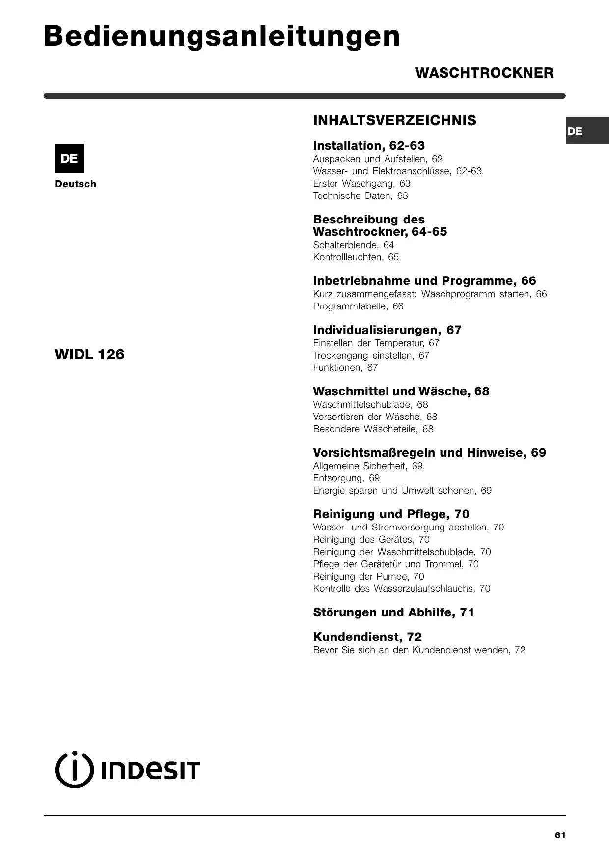 BEDIENUNGSANLEITUNG WIDL 126 INDESIT