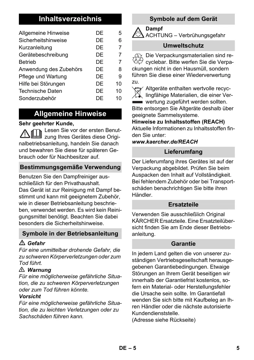 Allgemeine Hinweise Sehr geehrter Kunde, Lesen Sie vor der ersten Benutzung Ihres Gerätes diese Originalbetriebsanleitung, handeln Sie danach und bewahren Sie diese für späteren Gebrauch oder für Nachbesitzer auf. Bestimmungsgemäße Verwendung Benutzen Sie den Dampfreiniger ausschließlich für den Privathaushalt. Das Gerät ist zur Reinigung mit Dampf bestimmt und kann mit geeignetem Zubehör, wie in dieser Betriebsanleitung beschrieben, verwendet werden. Es wird kein Reinigungsmittel benötigt. Beachten Sie dabei besonders die Sicherheitshinweise. Symbole in der Betriebsanleitung Dampf ACHTUNG – Verbrühungsgefahr Umweltschutz Die Verpackungsmaterialien sind recyclebar. Bitte werfen Sie die Verpackungen nicht in den Hausmüll, sondern führen Sie diese einer Wiederverwertung zu. Altgeräte enthalten wertvolle recyclingfähige Materialien, die einer Verwertung zugeführt werden sollten. Bitte entsorgen Sie Altgeräte deshalb über geeignete Sammelsysteme. Hinweise zu Inhaltsstoffen (REACH) Aktuelle Informationen zu Inhaltsstoffen finden Sie unter: www.kaercher.de/REACH Lieferumfang Der Lieferumfang ihres Gerätes ist auf der Verpackung abgebildet. Prüfen Sie beim Auspacken den Inhalt auf Vollständigkeit. Bei fehlendem Zubehör oder bei Transportschäden benachrichtigen Sie bitte ihren Händler. Ersatzteile Verwenden Sie ausschließlich Original KÄRCHER Ersatzteile. Eine Ersatzteilübersicht finden Sie am Ende dieser Betriebsanleitung. Gefahr Für eine unmittelbar drohende Gefahr, die zu schweren Körperverletzungen oder zum Tod führt. 몇 Warnung Für eine möglicherweise gefährliche Situation, die zu schweren Körperverletzungen oder zum Tod führen könnte. Vorsicht Für eine möglicherweise gefährliche Situation, die zu leichten Verletzungen oder zu Sachschäden führen kann. Garantie In jedem Land gelten die von unserer zuständigen Vertriebsgesellschaft herausgegebenen Garantiebedingungen. Etwaige Störungen an Ihrem Gerät beseitigen wir innerhalb der Garantiefrist kostenlos, sofern ein Material- oder Herstellungsfehler die Ursache sein sollte. Im Garantiefall wenden Sie sich bitte mit Kaufbeleg an Ihren Händler oder die nächste autorisierte Kundendienststelle. (Adresse siehe Rückseite) DE – 5