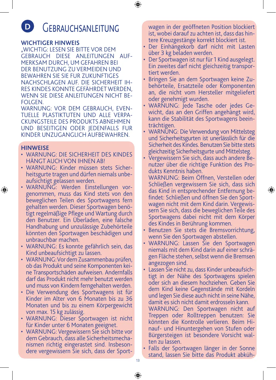 • AVERTISSEMENT : ne pas utilisier ce produit en faisant du jogging ou des promenadesen rollers. • Éviter le contact de la poussette avec de l’eau salée afin de prévenir la formation de rouille. • Ne pas utiliser la poussette à la plage. • AVERTISSEMENT : ce produit doit être utilisé uniquement par un adulte.