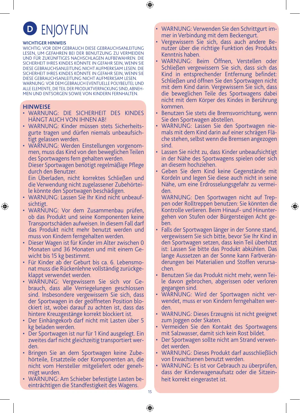 - Dieser Wagen ist für Kinder im Alter zwischen 0 Monaten und 36 Monaten und mit einem Gewicht bis 15 kg bestimmt.