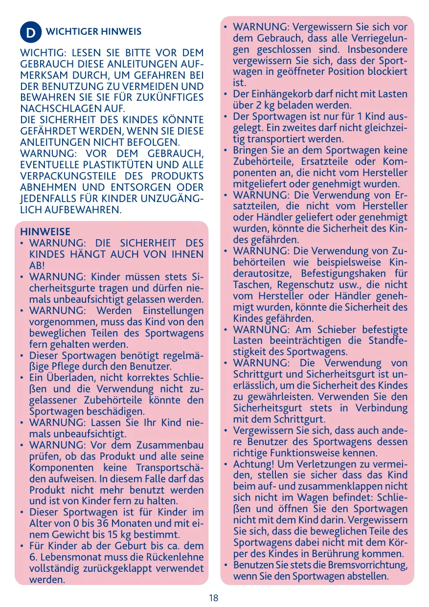 • Cette poussette doit être entretenue régulièrement par l’utilisateur. • Surcharger, mal fermer et utiliser des accessoires non approuvés pourrait endommager ou casser la poussette. • AVERTISSEMENTS: Il peut être dangereux de laisser votre enfant sans surveillance. • AVERTISSEMENT: avant l’assemblage, vérifier que le produit et tous ses éléments ne présentent aucun endommagement éventuel dû au transport; dans le cas contraire, le produit ne doit pas être utilisé et il devra être tenu hors de portée des enfants. • Ce véhicule est conçu pour des enfants de 0 à 36 mois à poids maximal 15 kg. • Pour des enfants de 0 à environ 6 mois, le dossier doit être complètement rabaissé. • AVERTISSEMENTS: S’assurer que tous les dispositifs de verrouillage sont correctement enclenchés avant utilisation.