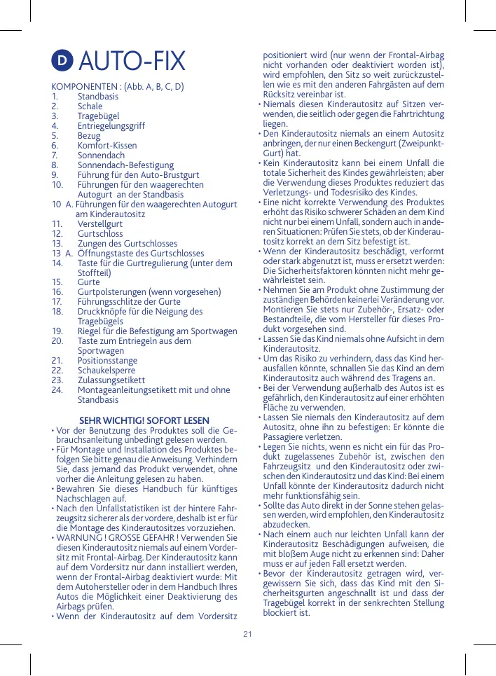 KOMPONENTEN : (Abb. A, B, C, D) 1. Standbasis 2. Schale 3. Tragebügel 4. Entriegelungsgriff 5. Bezug 6. Komfort-Kissen 7. Sonnendach 8. Sonnendach-Befestigung 9. Führung für den Auto-Brustgurt 10. Führungen für den waagerechten Autogurt an der Standbasis 10 A. Führungen für den waagerechten Autogurt am Kinderautositz 11. Verstellgurt 12. Gurtschloss 13. Zungen des Gurtschlosses 13 A. Öffnungstaste des Gurtschlosses 14. Taste für die Gurtregulierung (unter dem Stoffteil) 15. Gurte 16. Gurtpolsterungen (wenn vorgesehen) 17. Führungsschlitze der Gurte 18. Druckknöpfe für die Neigung des Tragebügels 19. Riegel für die Befestigung am Sportwagen 20. Taste zum Entriegeln aus dem Sportwagen 21. Positionsstange 22. Schaukelsperre 23. Zulassungsetikett 24. Montageanleitungsetikett mit und ohne Standbasis