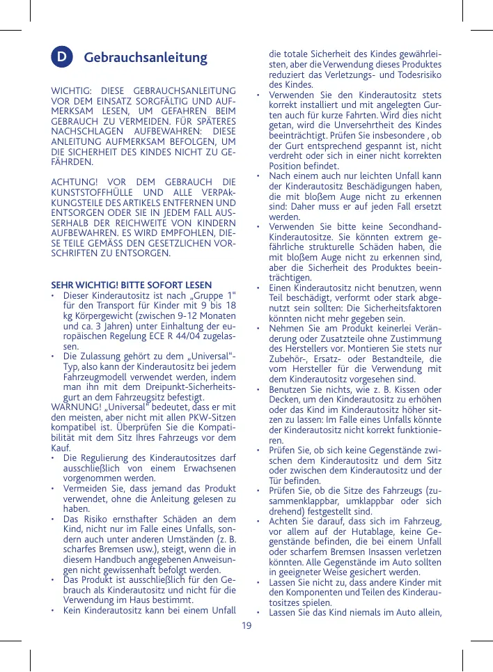 • Ce siège-auto est homologué “Universel” et peut donc être installé sur la quasi totalité des véhicules en l’accrochant à l’aide de la ceinture à trois points du siège de la voiture. ATTENTION ! “Universel” signifie qu’il est compatible avec la plupart des véhicules – ce qui ne signifie pas tous les véhicules. Il faut donc vérifier la compatibilité du siège-auto avec votre voiture avant l’achat. • Le réglage du siège-auto doit être fait uniquement par un adulte. • Ne pas utiliser ce produit sans avoir préalablement lu les instructions. • Le risque de dommages graves pour l’enfant augmente si les indications de cette notice ne sont pas suivies scrupuleusement. Ce risque n’intervient pas uniquement en cas d’accident, mais aussi dans d’autres situations (ex. freinages brusques, etc.). • Le produit est exclusivement destiné à servir de siège-auto. Il n’est pas prévu pour une utilisation à la maison, ou aucune autre utilisation. • Aucun siège-auto ne peut garantir la sécurité totale de l’enfant en cas d’accident,