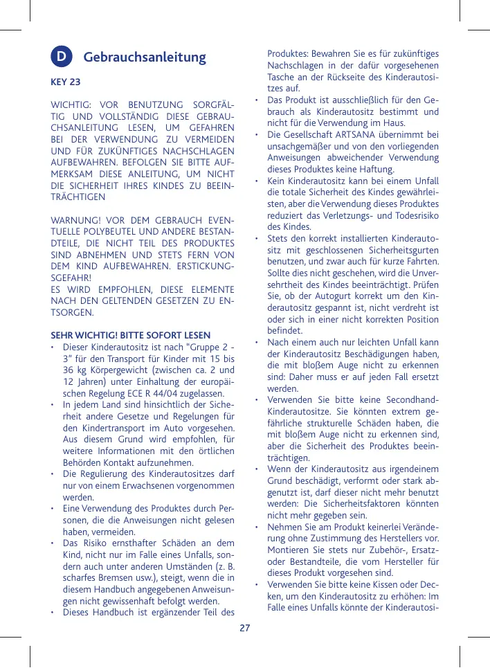 SEHR WICHTIG! BITTE SOFORT LESEN • Dieser Kinderautositz ist nach “Gruppe 2 3” für den Transport für Kinder mit 15 bis 36 kg Körpergewicht (zwischen ca. 2 und 12 Jahren) unter Einhaltung der europäischen Regelung ECE R 44/04 zugelassen. • In jedem Land sind hinsichtlich der Sicherheit andere Gesetze und Regelungen für den Kindertransport im Auto vorgesehen. Aus diesem Grund wird empfohlen, für weitere Informationen mit den örtlichen Behörden Kontakt aufzunehmen. • Die Regulierung des Kinderautositzes darf nur von einem Erwachsenen vorgenommen werden. • Eine Verwendung des Produktes durch Personen, die die Anweisungen nicht gelesen haben, vermeiden. • Das Risiko ernsthafter Schäden an dem Kind, nicht nur im Falle eines Unfalls, sondern auch unter anderen Umständen (z. B. scharfes Bremsen usw.), steigt, wenn die in diesem Handbuch angegebenen Anweisungen nicht gewissenhaft befolgt werden. • Dieses Handbuch ist ergänzender Teil des