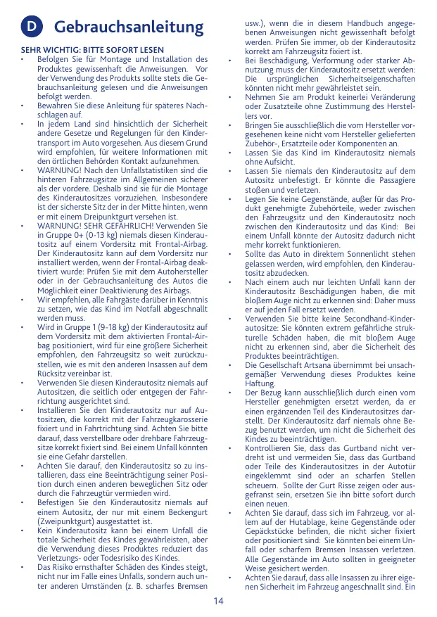 SEHR WICHTIG: BITTE SOFORT LESEN • Befolgen Sie für Montage und Installation des Produktes gewissenhaft die Anweisungen. Vor der Verwendung des Produkts sollte stets die Gebrauchsanleitung gelesen und die Anweisungen befolgt werden. • Bewahren Sie diese Anleitung für späteres Nachschlagen auf. • In jedem Land sind hinsichtlich der Sicherheit andere Gesetze und Regelungen für den Kindertransport im Auto vorgesehen. Aus diesem Grund wird empfohlen, für weitere Informationen mit den örtlichen Behörden Kontakt aufzunehmen. • WARNUNG! Nach den Unfallstatistiken sind die hinteren Fahrzeugsitze im Allgemeinen sicherer als der vordere. Deshalb sind sie für die Montage des Kinderautositzes vorzuziehen. Insbesondere ist der sicherste Sitz der in der Mitte hinten, wenn er mit einem Dreipunktgurt versehen ist. • WARNUNG! SEHR GEFÄHRLICH! Verwenden Sie in Gruppe 0+ (0-13 kg) niemals diesen Kinderautositz auf einem Vordersitz mit Frontal-Airbag. Der Kinderautositz kann auf dem Vordersitz nur installiert werden, wenn der Frontal-Airbag deaktiviert wurde: Prüfen Sie mit dem Autohersteller oder in der Gebrauchsanleitung des Autos die Möglichkeit einer Deaktivierung des Airbags. • Wir empfehlen, alle Fahrgäste darüber in Kenntnis zu setzen, wie das Kind im Notfall abgeschnallt werden muss. • Wird in Gruppe 1 (9-18 kg) der Kinderautositz auf dem Vordersitz mit dem aktivierten Frontal-Airbag positioniert, wird für eine größere Sicherheit empfohlen, den Fahrzeugsitz so weit zurückzustellen, wie es mit den anderen Insassen auf dem Rücksitz vereinbar ist. • Verwenden Sie diesen Kinderautositz niemals auf Autositzen, die seitlich oder entgegen der Fahrrichtung ausgerichtet sind. • Installieren Sie den Kinderautositz nur auf Autositzen, die korrekt mit der Fahrzeugkarosserie fixiert und in Fahrtrichtung sind. Achten Sie bitte darauf, dass verstellbare oder drehbare Fahrzeugsitze korrekt fixiert sind. Bei einem Unfall könnten sie eine Gefahr darstellen. • Achten Sie darauf, den Kinderautositz so zu installieren, dass eine Beeinträchtigung seiner Position durch einen anderen beweglichen Sitz oder durch die Fahrzeugtür vermieden wird. • Befestigen Sie den Kinderautositz niemals auf einem Autositz, der nur mit einem Beckengurt (Zweipunktgurt) ausgestattet ist. • Kein Kinderautositz kann bei einem Unfall die totale Sicherheit des Kindes gewährleisten, aber die Verwendung dieses Produktes reduziert das Verletzungs- oder Todesrisiko des Kindes. • Das Risiko ernsthafter Schäden des Kindes steigt, nicht nur im Falle eines Unfalls, sondern auch unter anderen Umständen (z. B. scharfes Bremsen