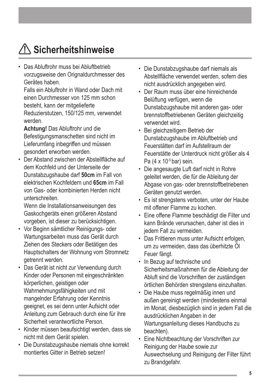 Le bruit de fonctionnement sera un peu plus élevé. Attention ! Le tuyau d’évacuation et les colliers de fixation ne sont pas fournis et doivent être achetés à part.. • La distance minimum entre la superficie de support des récipients sur le dispositif de cuisson et la partie la plus basse de la hotte de cuisine ne doit pas être inférieure à 50cm dans le cas de cuisinières électriques et de 65cm dans le cas de cuisinières à gaz ou mixtes. Si les instructions d’installation du dispositif de cuisson au gaz spécifient une plus grande distance, il faut en tenir compte. • Avant toute opération de nettoyage ou d’entretien, débrancher la hotte du circuit électrique en retirant la prise ou en coupant l’interrupteur général de l’habitation. • L’appareil n’est pas destiné à une utilisation par des enfants ou des personnes à capacités physiques, sensorielles ou mentales réduites et sans expérience et connaissance à moins qu’ils ne soient sous la supervision ou formés sur l’utilisation de l’appareil par une personne responsable de leur sécurité. • Les enfants doivent être surveillés afin qu’ils ne jouent pas avec l’appareil. • Ne jamais utiliser la hotte sans que la grille ne 38