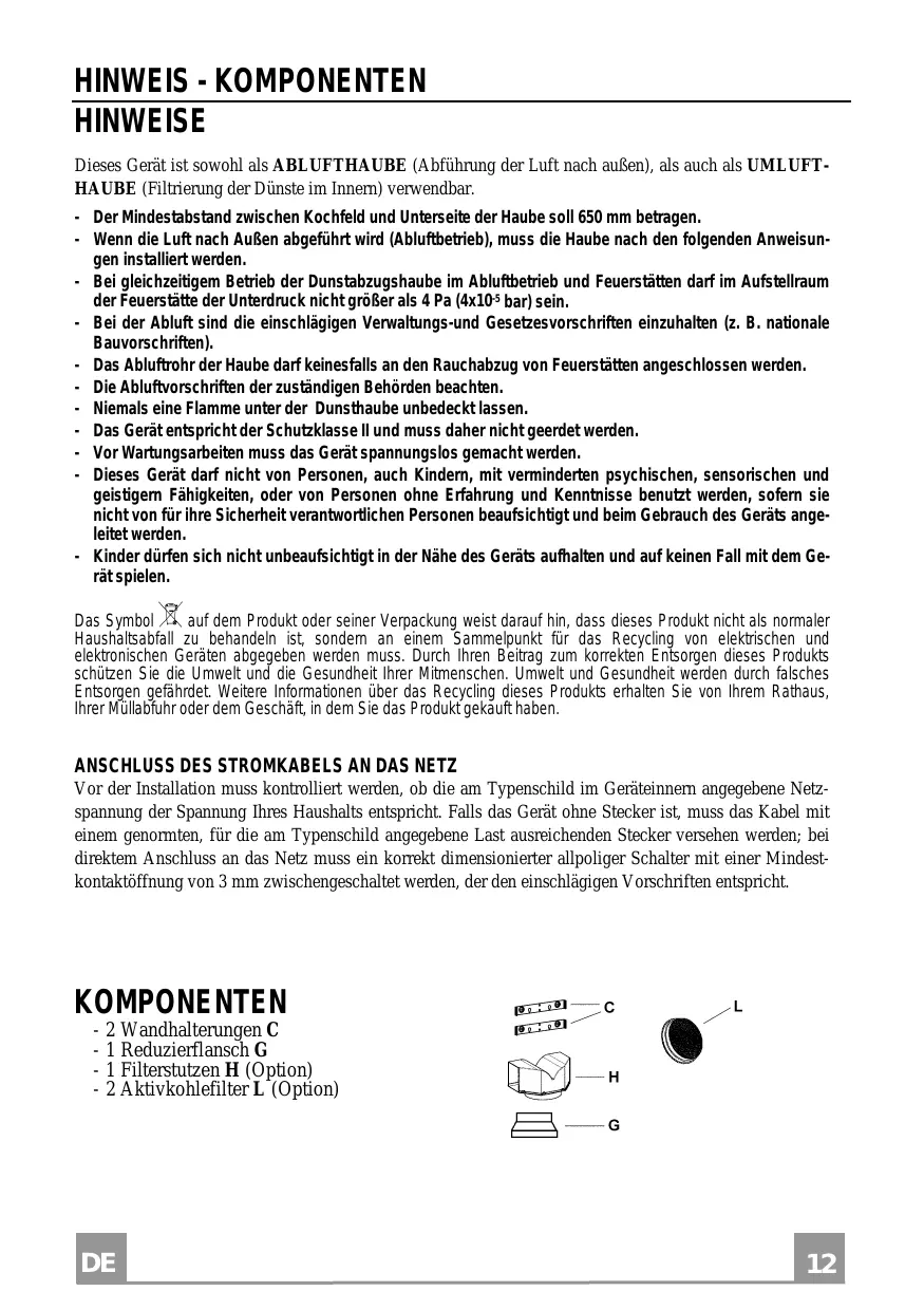 - La campana ha sido construida con aislamiento de Clase II por lo tanto no necesita conexiones de tierra. - Antes de efectuar todas las operaciones de mantenimiento desconectar el aparato de la alimentación eléctrica. - Este aparato no tiene que ser utilizado por personas (niños incluídos) con capacidades psíquicas, sensoriales o mentales reducidas, o bien por personas sin experiencia y conocimientos en la materia, a menos que no lo hagan bajo el control, o instruídos, por personas responsables de su seguridad. - Controlar que los niños no jueguen con el aparato.
