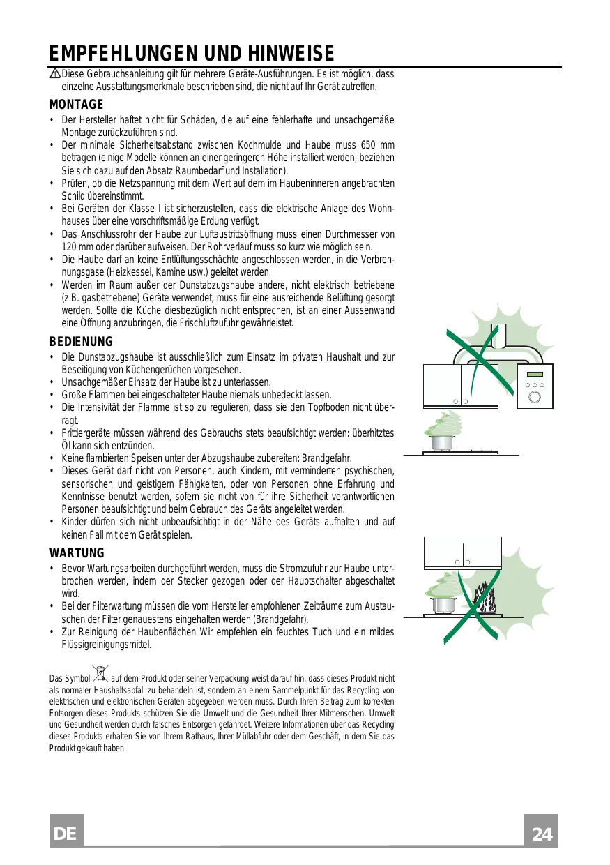 - Große Flammen bei eingeschalteter Haube niemals unbedeckt lassen.