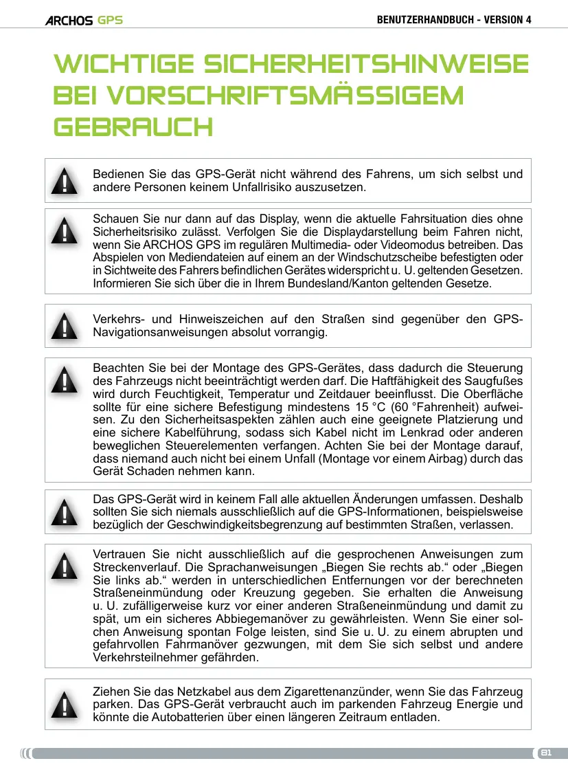 Bedienen Sie das GPS-Gerät nicht während des Fahrens, um sich selbst und andere Personen keinem Unfallrisiko auszusetzen. Schauen Sie nur dann auf das Display, wenn die aktuelle Fahrsituation dies ohne Sicherheitsrisiko zulässt. Verfolgen Sie die Displaydarstellung beim Fahren nicht, wenn Sie ARCHOS GPS im regulären Multimedia- oder Videomodus betreiben. Das Abspielen von Mediendateien auf einem an der Windschutzscheibe befestigten oder in Sichtweite des Fahrers befindlichen Gerätes widerspricht u. U. geltenden Gesetzen. Informieren Sie sich über die in Ihrem Bundesland/Kanton geltenden Gesetze. Verkehrs- und Hinweiszeichen auf den Straßen sind gegenüber den GPSNavigationsanweisungen absolut vorrangig. Beachten Sie bei der Montage des GPS-Gerätes, dass dadurch die Steuerung des Fahrzeugs nicht beeinträchtigt werden darf. Die Haftfähigkeit des Saugfußes wird durch Feuchtigkeit, Temperatur und Zeitdauer beeinflusst. Die Oberfläche sollte für eine sichere Befestigung mindestens 15 °C (60 °Fahrenheit) aufweisen. Zu den Sicherheitsaspekten zählen auch eine geeignete Platzierung und eine sichere Kabelführung, sodass sich Kabel nicht im Lenkrad oder anderen beweglichen Steuerelementen verfangen. Achten Sie bei der Montage darauf, dass niemand auch nicht bei einem Unfall (Montage vor einem Airbag) durch das Gerät Schaden nehmen kann. Das GPS-Gerät wird in keinem Fall alle aktuellen Änderungen umfassen. Deshalb sollten Sie sich niemals ausschließlich auf die GPS-Informationen, beispielsweise bezüglich der Geschwindigkeitsbegrenzung auf bestimmten Straßen, verlassen. Vertrauen Sie nicht ausschließlich auf die gesprochenen Anweisungen zum Streckenverlauf. Die Sprachanweisungen „Biegen Sie rechts ab.“ oder „Biegen Sie links ab.“ werden in unterschiedlichen Entfernungen vor der berechneten Straßeneinmündung oder Kreuzung gegeben. Sie erhalten die Anweisung u. U. zufälligerweise kurz vor einer anderen Straßeneinmündung und damit zu spät, um ein sicheres Abbiegemanöver zu gewährleisten. Wenn Sie einer solchen Anweisung spontan Folge leisten, sind Sie u. U. zu einem abrupten und gefahrvollen Fahrmanöver gezwungen, mit dem Sie sich selbst und andere Verkehrsteilnehmer gefährden. Ziehen Sie das Netzkabel aus dem Zigarettenanzünder, wenn Sie das Fahrzeug parken. Das GPS-Gerät verbraucht auch im parkenden Fahrzeug Energie und könnte die Autobatterien über einen längeren Zeitraum entladen.