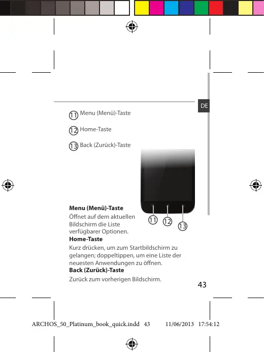 11 Menu (Menü)-Taste 12 Home-Taste 13 Back (Zurück)-Taste Menu (Menü)-Taste Öffnet auf dem aktuellen Bildschirm die Liste verfügbarer Optionen. Home-Taste Kurz drücken, um zum Startbildschirm zu gelangen; doppeltippen, um eine Liste der neuesten Anwendungen zu öffnen. Back (Zurück)-Taste Zurück zum vorherigen Bildschirm. ARCHOS_50_Platinum_book_quick.indd 43