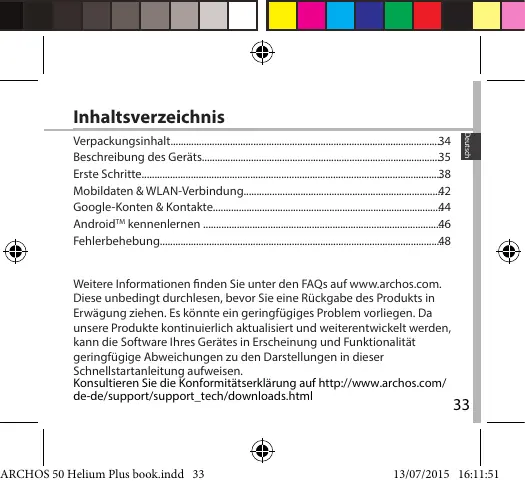 - ARCHOS 50 Helium Plus book.indd 32 13/07/2015 16:11:51 Inhaltsverzeichnis Weitere Informationen finden Sie unter den FAQs auf www.archos.com. Diese unbedingt durchlesen, bevor Sie eine Rückgabe des Produkts in Erwägung ziehen. Es könnte ein geringfügiges Problem vorliegen. Da unsere Produkte kontinuierlich aktualisiert und weiterentwickelt werden, kann die Software Ihres Gerätes in Erscheinung und Funktionalität geringfügige Abweichungen zu den Darstellungen in dieser Schnellstartanleitung aufweisen. Konsultieren Sie die Konformitätserklärung auf http://www.archos.com/ de-de/support/support_tech/downloads.html ARCHOS 50 Helium Plus book.indd 33 Deutsch Verpackungsinhalt p. 34