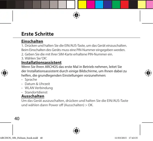 Installationsassistent Wenn Sie Inren ARCHOS des erste Mal in Betrieb nehmen, leitet Sie & der Installationsassistent durch einige Bildschirme, um Ihnen dabei zu helfen, die grundlegenden Einstellungen vorzunehmen: - Sprache = Datum & Uhræeit = MILAN Verbindung Standortdienst Ausschalten Um des Gert auszuschalten, drücken und halten Sie die EIN/AUS-Taste und wählen dann Power of (Ausschalten) > OK.