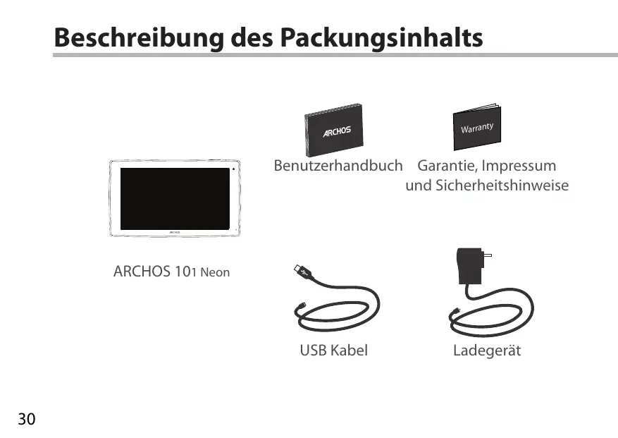 Beschreibung des Packungsinhalts Warran Warran Benutzerhandbuch Garantie, Impressum und Sicherheitshinweise ARCHOS 101 Neon USB Kabel