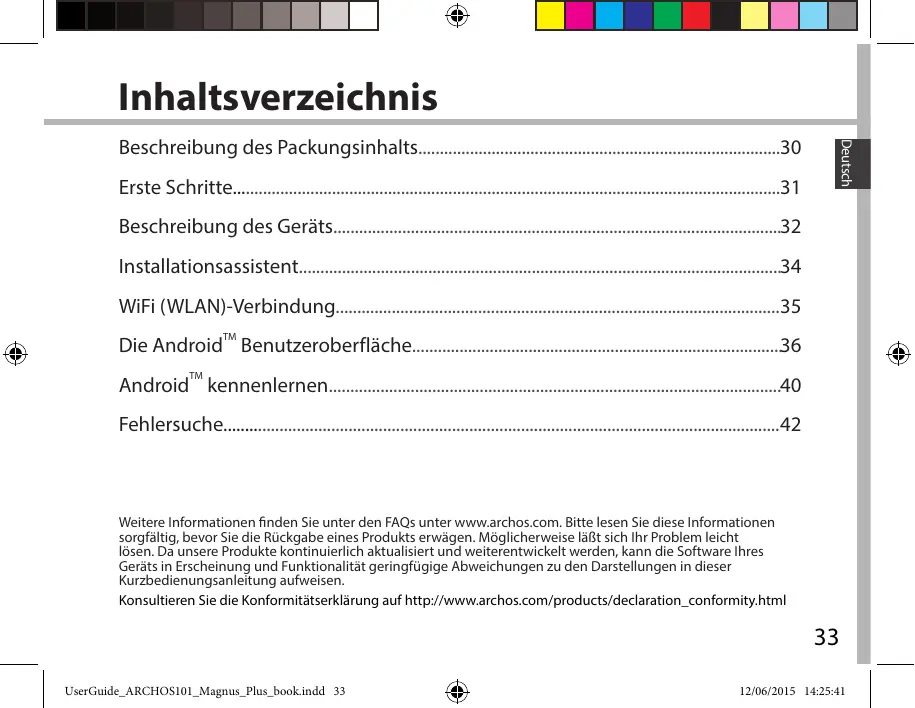 Android kennenlernen.........................................................................................................40 Fehlersuche.................................................................................................................................42 Weitere Informationen finden Sie unter den FAQs unter www.archos.com. Bitte lesen Sie diese Informationen sorgfältig, bevor Sie die Rückgabe eines Produkts erwägen. Möglicherweise läßt sich Ihr Problem leicht lösen. Da unsere Produkte kontinuierlich aktualisiert und weiterentwickelt werden, kann die Software Ihres Geräts in Erscheinung und Funktionalität geringfügige Abweichungen zu den Darstellungen in dieser Kurzbedienungsanleitung aufweisen. Konsultieren Sie die Konformitätserklärung auf http://www.archos.com/products/declaration_conformity.html