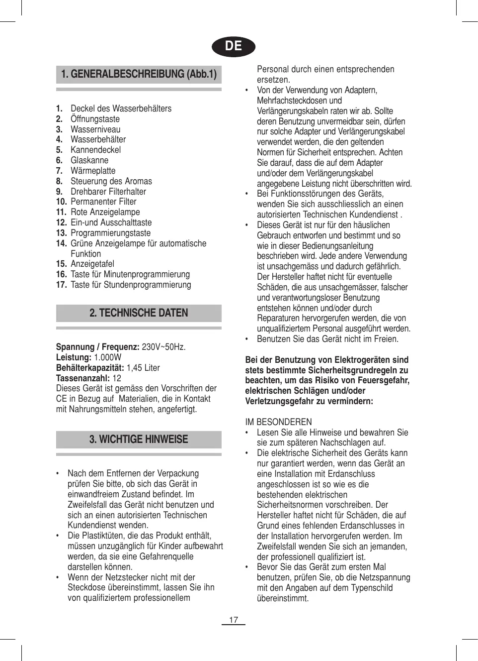 Vor der ersten Benutzung ihrer Kaffemaschine machen Sie sich mit allen Teilen vertraut. Lesen Sie aufmerksam die Bedienungsanleitung.