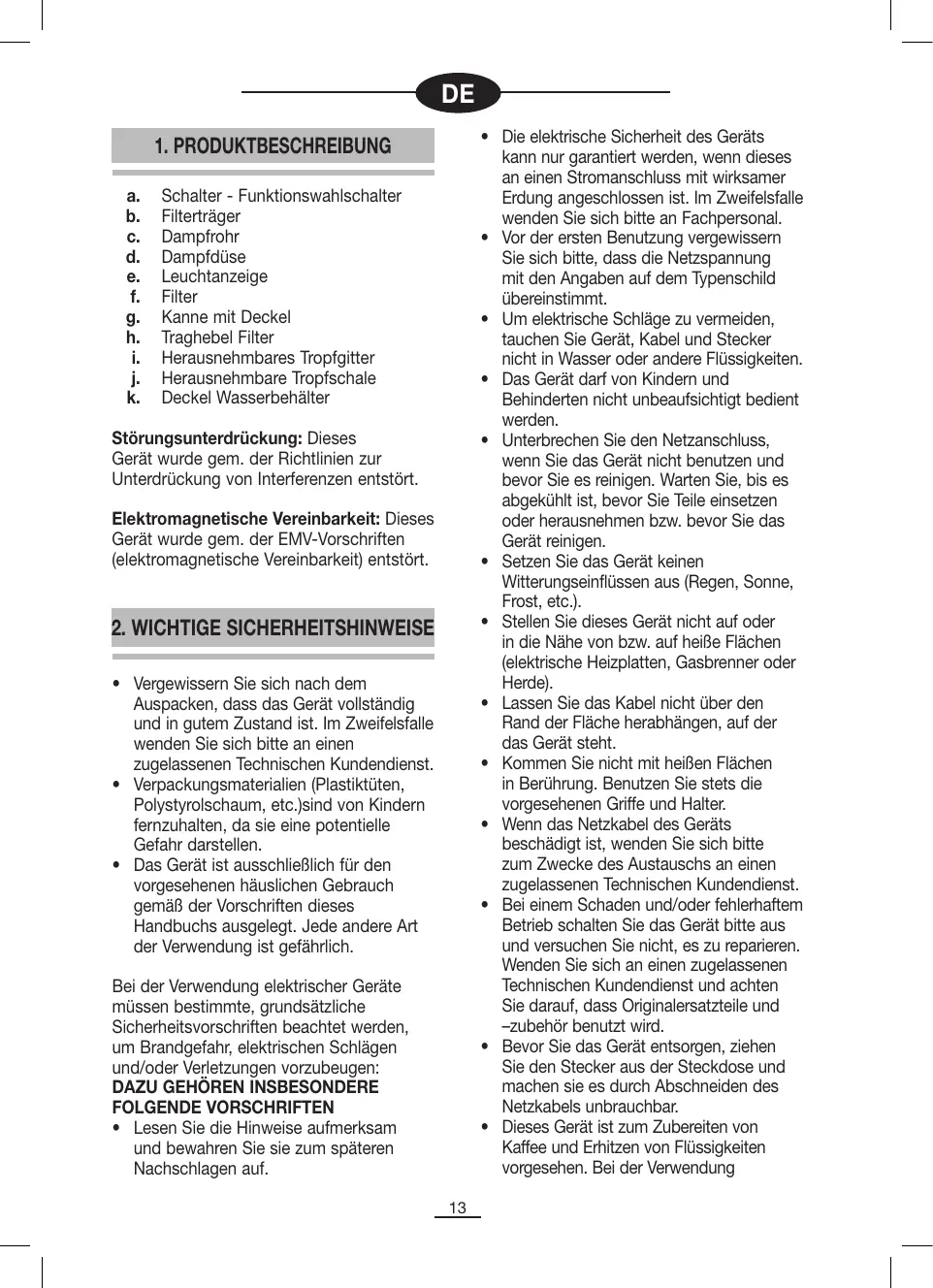 Schalter - Funktionswahlschalter Filterträger Dampfrohr Dampfdüse Leuchtanzeige Filter Kanne mit Deckel Traghebel Filter Herausnehmbares Tropfgitter Herausnehmbare Tropfschale Deckel Wasserbehälter Störungsunterdrückung: Dieses Gerät wurde gem. der Richtlinien zur Unterdrückung von Interferenzen entstört. Elektromagnetische Vereinbarkeit: Dieses Gerät wurde gem. der EMV-Vorschriften (elektromagnetische Vereinbarkeit) entstört.