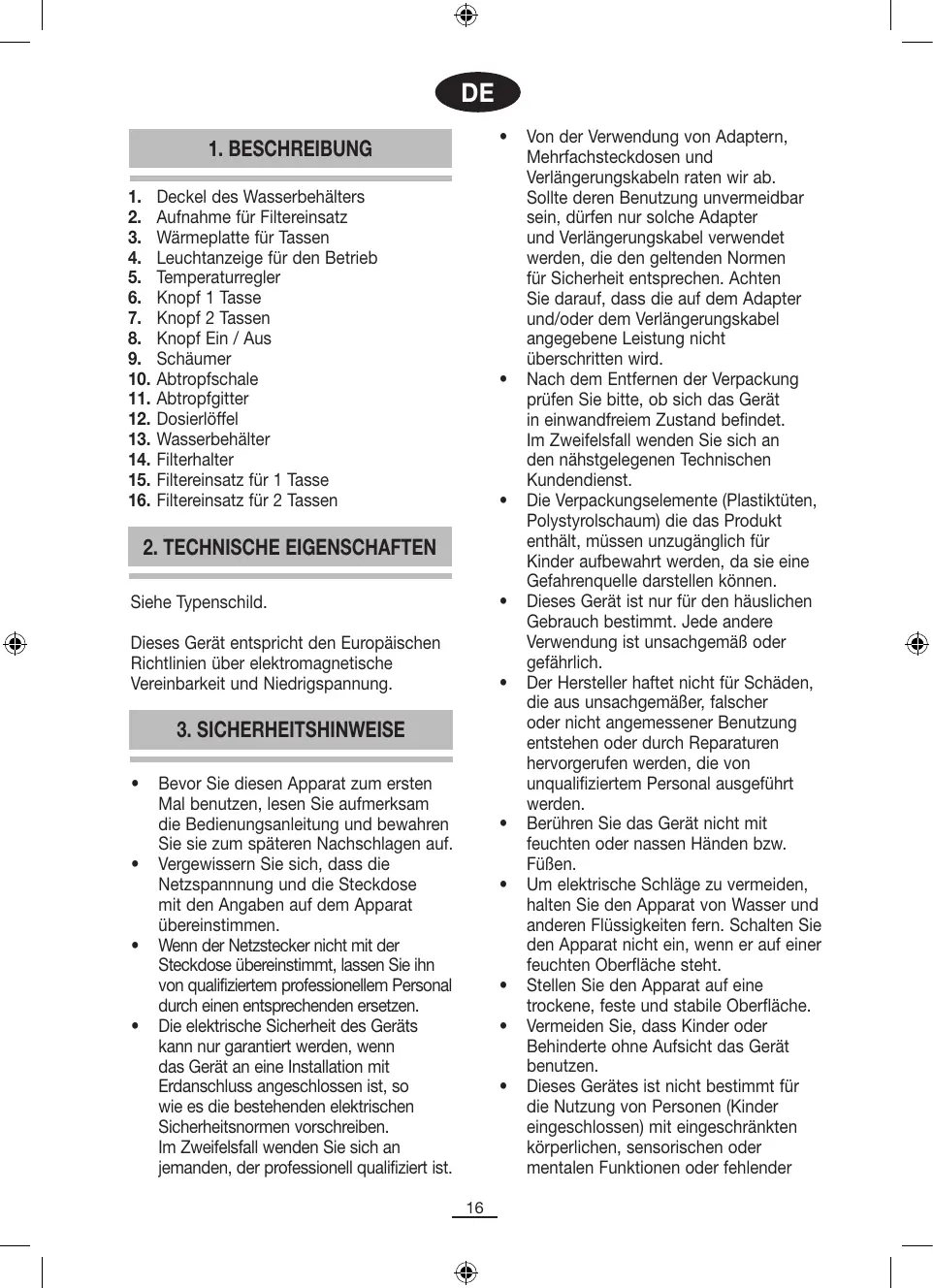 Deckel des Wasserbehälters Aufnahme für Filtereinsatz Wärmeplatte für Tassen Leuchtanzeige für den Betrieb Temperaturregler Knopf 1 Tasse Knopf 2 Tassen Knopf Ein / Aus Schäumer Abtropfschale Abtropfgitter Dosierlöffel Wasserbehälter Filterhalter Filtereinsatz für 1 Tasse Filtereinsatz für 2 Tassen
