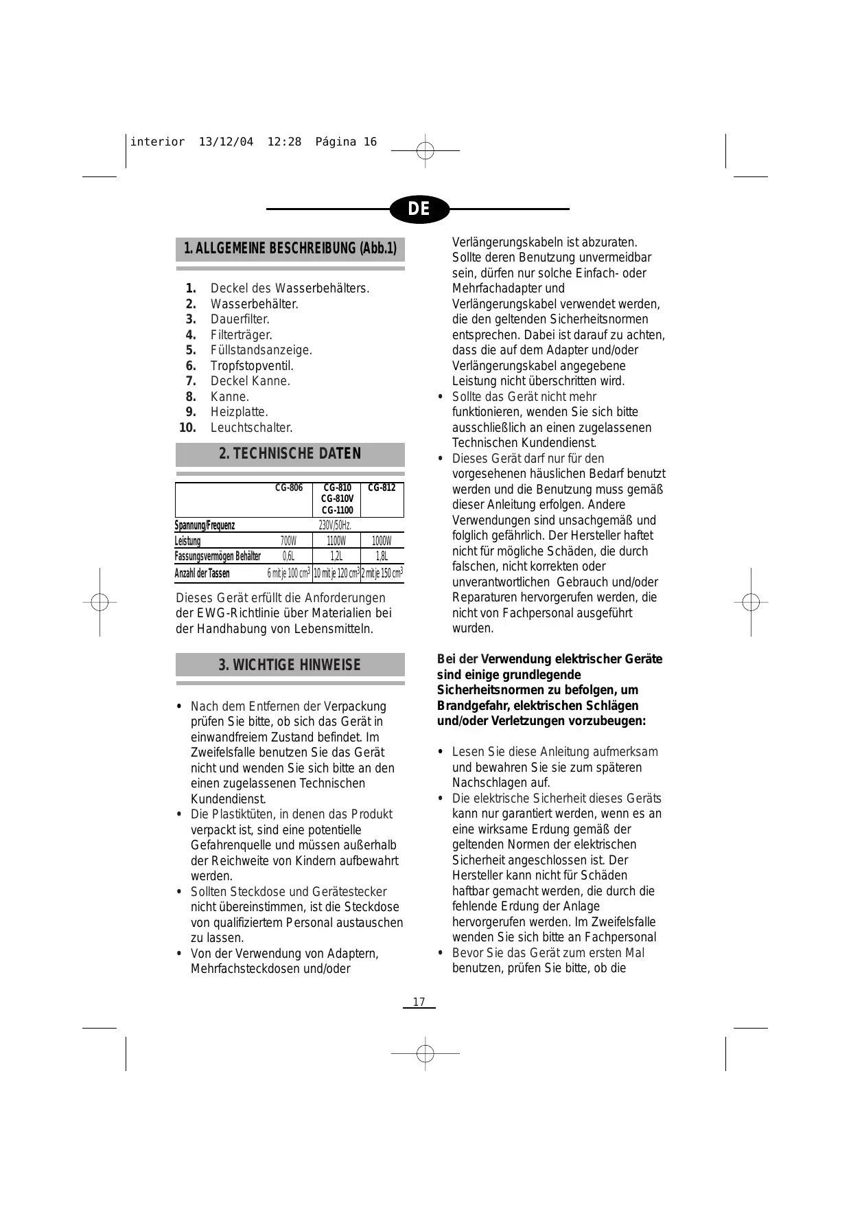 CG-806 CG-810 CG-810V CG-1100 CG-812 Spannung/Frequenz 230V/50Hz. Leistung 700W 1100W 1000W Fassungsvermögen Behälter 0,6L 1,2L 1,8L Anzahl der Tassen 6 mit je 100 cm3 10 mit je 120 cm3 2 mit je 150 cm3 Dieses Gerät erfüllt die Anforderungen der EWG-Richtlinie über Materialien bei der Handhabung von Lebensmitteln. Bei der Verwendung elektrischer Geräte sind einige grundlegende Sicherheitsnormen zu befolgen, um Brandgefahr, elektrischen Schlägen und/oder Verletzungen vorzubeugen: