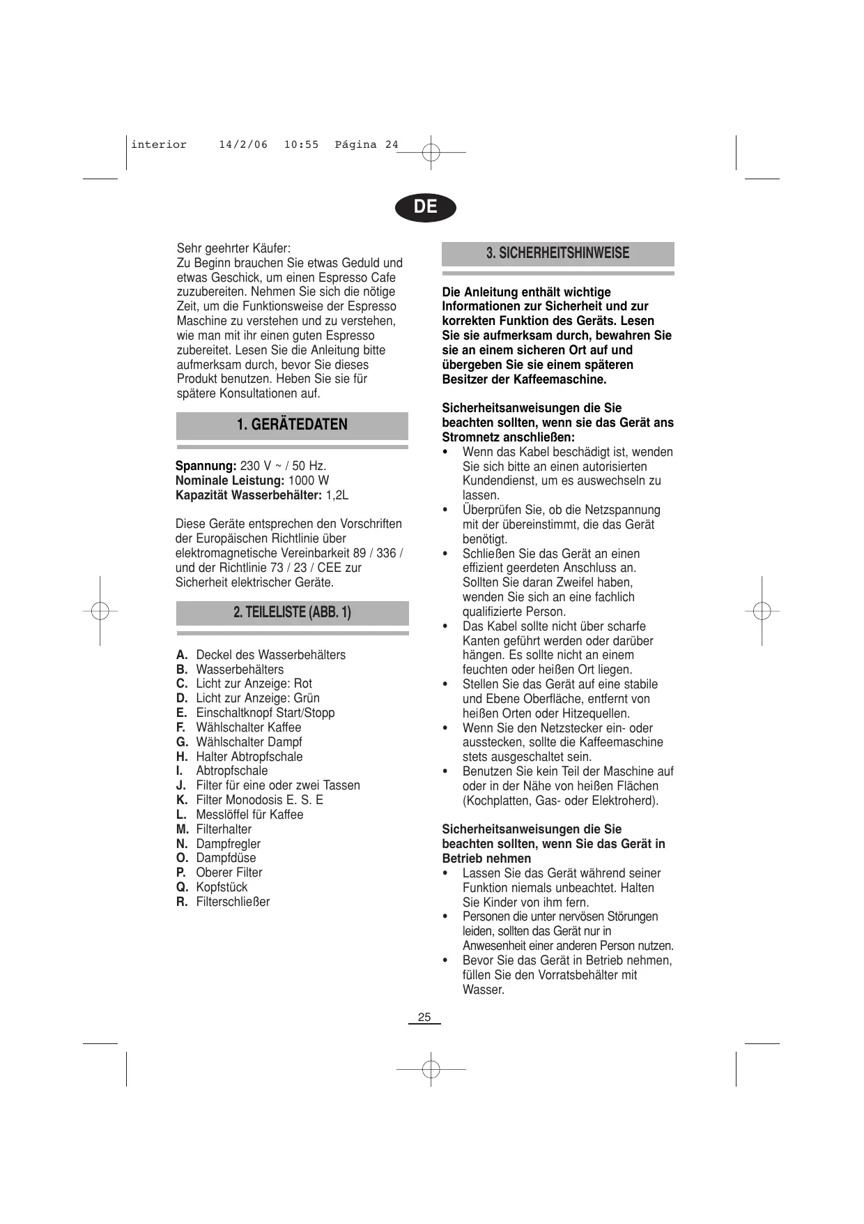 Deckel des Wasserbehälters Wasserbehälters Licht zur Anzeige: Rot Licht zur Anzeige: Grün Einschaltknopf Start/Stopp Wählschalter Kaffee Wählschalter Dampf Halter Abtropfschale Abtropfschale Filter für eine oder zwei Tassen Filter Monodosis E. S. E Messlöffel für Kaffee Filterhalter Dampfregler Dampfdüse Oberer Filter Kopfstück Filterschließer Sicherheitsanweisungen die Sie beachten sollten, wenn Sie das Gerät in Betrieb nehmen