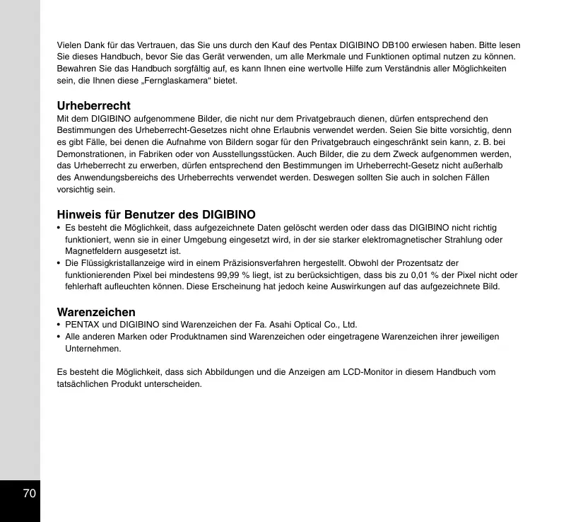 Vielen Dank für das Vertrauen, das Sie uns durch den Kauf des Pentax DIGIBINO DB100 erwiesen haben.itte lessen Sie theseu Handbuch, bevor Sie das Gerat verwenden, um alle Merkmale und Funktionen optimal nutzen zu konnen. Bewahren Sie das Handbuch sorgfaltig auf, es kann Ihnen eine wertvolle Hilfe zum Verstandnis aller Mochlichkeiten sein, die Ihnen dieser „Fernglaskamera" bietet.