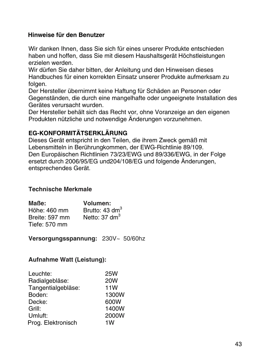Dieses Gerät entspricht in den Teilen, die ihrem Zweck gemäß mit Lebensmitteln in Berührungkommen, der EWG-Richtlinie 89/109. Den Europäischen Richtlinien 73/23/EWG und 89/336/EWG, in der Folge ersetzt durch 2006/95/EG und204/108/EG und folgende Änderungen, entsprechendes Gerät. Technische Merkmale Maße: Höhe: 460 mm Breite: 597 mm Tiefe: 570 mm Volumen: Brutto: 43 dm3 Netto: 37 dm3 Versorgungsspannung: 230V~ 50/60hz Aufnahme Watt (Leistung): Leuchte: Radialgebläse: Tangentialgebläse: Boden: Decke: Grill: Umluft: Prog. Elektronisch 25W 20W 11W 1300W 600W 1400W 2000W