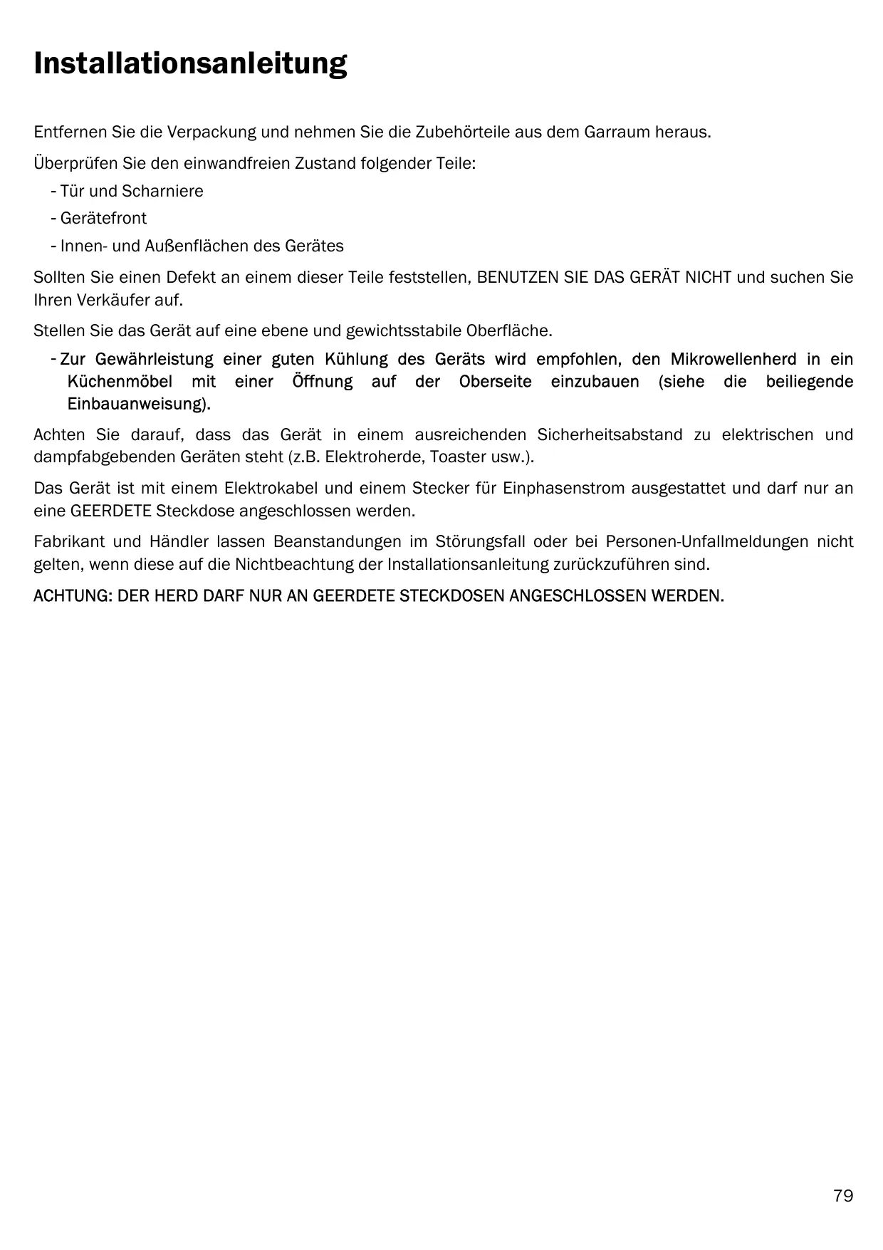 Installationsanleitung Entfernen Sie die Verpackung und nehmen Sie die Zubehörteile aus dem Garraum heraus. Überprüfen Sie den einwandfreien Zustand folgender Teile: - Tür und Scharniere - Gerätefront - Innen- und Außenflächen des Gerätes Sollten Sie einen Defekt an einem dieser Teile feststellen, BENUTZEN SIE DAS GERÄT NICHT und suchen Sie Ihren Verkäufer auf. Stellen Sie das Gerät auf eine ebene und gewichtsstabile Oberfläche. - Zur Gewährleistung einer guten Kühlung des Geräts wird empfohlen, den Mikrowellenherd in ein Küchenmöbel mit einer Öffnung auf der Oberseite einzubauen (siehe die beiliegende Einbauanweisung). Achten Sie darauf, dass das Gerät in einem ausreichenden Sicherheitsabstand zu elektrischen und dampfabgebenden Geräten steht (z.B. Elektroherde, Toaster usw.). Das Gerät ist mit einem Elektrokabel und einem Stecker für Einphasenstrom ausgestattet und darf nur an eine GEERDETE Steckdose angeschlossen werden. Fabrikant und Händler lassen Beanstandungen im Störungsfall oder bei Personen-Unfallmeldungen nicht gelten, wenn diese auf die Nichtbeachtung der Installationsanleitung zurückzuführen sind. ACHTUNG: DER HERD DARF NUR AN GEERDETE STECKDOSEN ANGESCHLOSSEN WERDEN.
