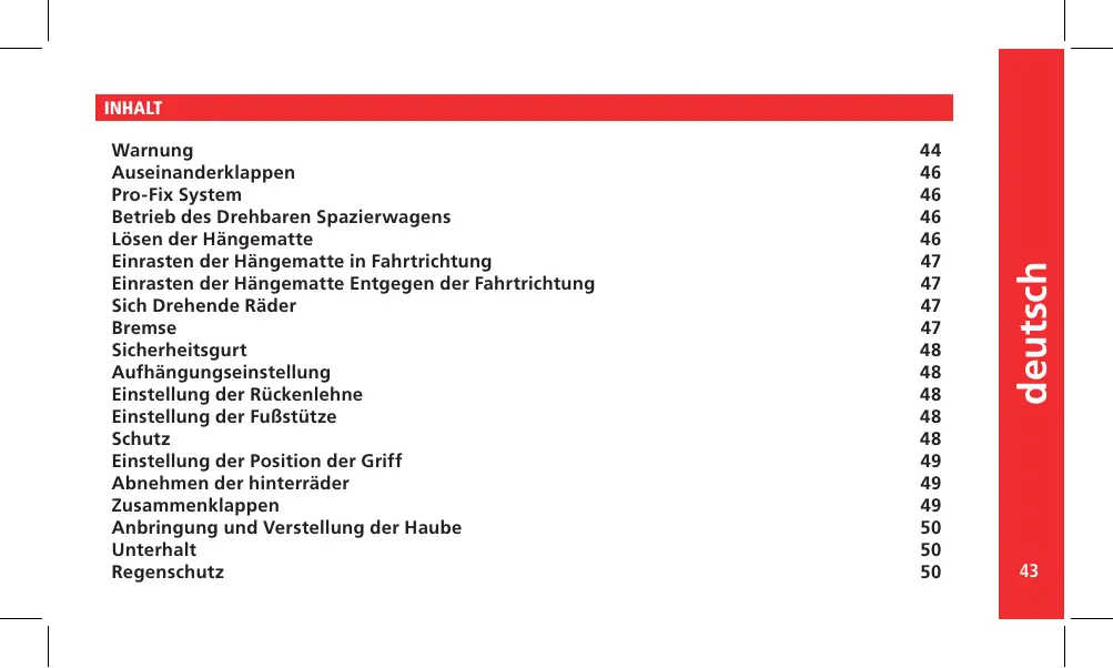 Warnung Auseinanderklappen Pro-Fix System Betrieb des Drehbaren Spazierwagens Lösen der Hängematte Einrasten der Hängematte in Fahrtrichtung Einrasten der Hängematte Entgegen der Fahrtrichtung Sich Drehende Räder Bremse Sicherheitsgurt Aufhängungseinstellung Einstellung der Rückenlehne Einstellung der Fußstütze Schutz Einstellung der Position der Griff Abnehmen der hinterräder Zusammenklappen Anbringung und Verstellung der Haube Unterhalt Regenschutz