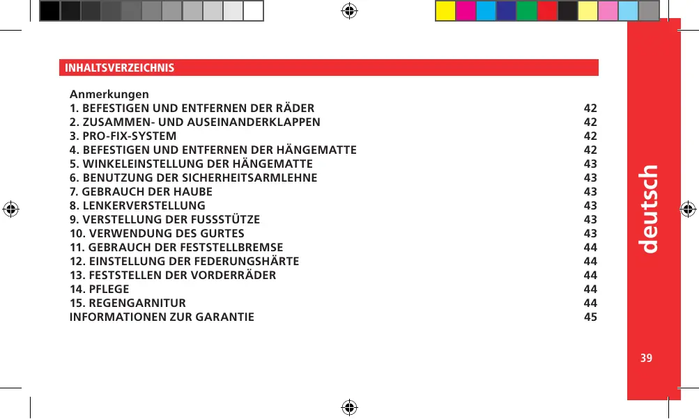 14.- PFLEGE Setzen Sie den Bezug nicht für lange Zeit der Sonne aus. Waschen Sie die Plastikteile mit lauwarmem Wasser und Seife und trocken Sie danach alle Teile sorgfältig ab. Überprüfen Sie regelmäßig die Bremsen, die Hosenträgergurte und die Befestigungen, die aufgrund der Benutzung Schäden erleiden können. Denken Sie daran Ihre Bremse regelmäßig nach der in Abbildung 18 erklärten Methode einzustellen. Sowohl zu Ihrer Sicherheit als auch zur guten Konservierung des Produktes ist es wichtig, eine regelmäßige Überprüfung in einer unserer offiziellen Werkstätten vornehmen zu lassen. 15.- REGENSCHUTZ Der Regenschutz Ihres RIDER ist sehr leicht anzubringen. Sie müssen nur die Hängematte abdecken und die Verschlüsse dem Fahrgestell anpassen, um ihn zu befestigen. Er besitzt ein kleines Fenster, das aufgerollt und mit Klettbändern befestigt werden kann, damit das Kind völlig frei seine Umgebung erkunden kann. 21 Dieser Artikel hat Garantie laut den Bestimmungen des Gesetzes 23 /2003 vom 10. Juli 2003. Bewahren Sie diese Einkaufsrechnung auf. Ihre Vorlage in dem Laden, wo Sie das Produkt erworben haben, ist unumgänglich, um ihre Gültigkeit bei jeder Reklamation zu beweisen. Jene Mängel oder Schäden, die durch unsachgemäßen Gebrauch des Artikels oder Nichteinhaltung der in der Bedienungsanleitung und auf den Pflegeetiketten beschriebenen Sicherheits- und Wartungsvorschriften verursacht wurden, sind von der vorliegenden Garantie ausgeschlossen, ebenso wie die Verschleißteile durch normalen Gebrauch und täglichen Umgang. Das Etikett, das die Fahrgestellnummer Ihres Modells enthält, darf unter keinen Umständen abgerissen werden, denn es enthält wichtige Informationen. Achtung: Um maximale Sicherheit und Betreuung für Ihren neuen JANÉ zu erhalten, ist es sehr wichtig, dass Sie die Registrierungskarte, die Sie auf der Webseite www.jane.es finden, ausfüllen. Die Registrierung wird Ihnen ermöglichen, falls notwendig, sich über die Entwicklung und Pflege Ihres Produktes zu informieren. Ebenso können wir Sie, wenn Sie es wünschen, über die neuesten Modelle oder Nachrichten, die unserer Ansicht nach für Sie von Interesse sind, informieren. deutsch