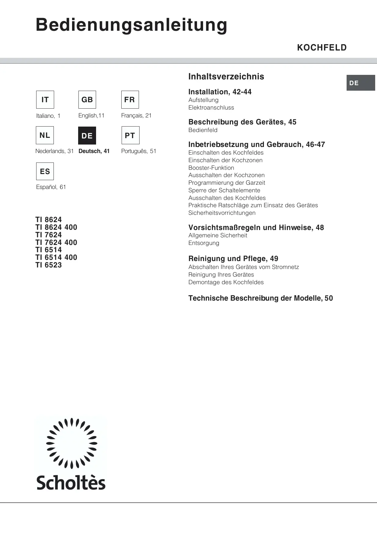 TI 6514 - Kochfeld SCHOLTES - Kostenlose Bedienungsanleitung